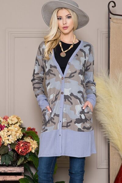 Celeste Full Size Camouflage Button Up Long Sleeve Cardigan Plus Size