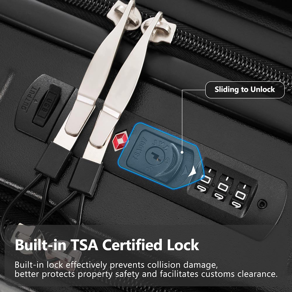 For enhanced security, the carry-on luggage includes a 3-dial TSA-approved lock. Additionally, the lock features a USB charging port (power bank not included), allowing you to charge your mobile devices on the go.