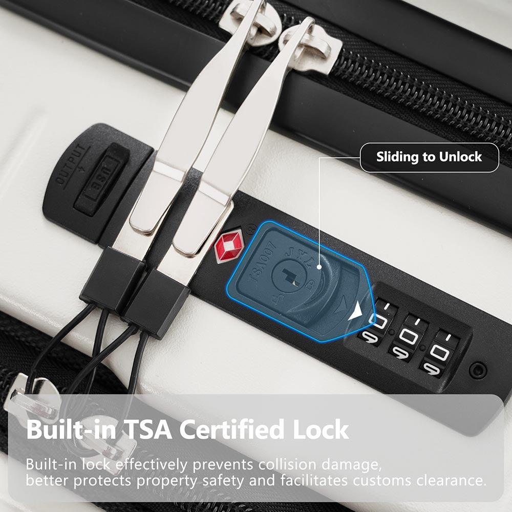 For enhanced security, the carry-on luggage includes a 3-dial TSA-approved lock. Additionally, the lock features a USB charging port (power bank not included), allowing you to charge your mobile devices on the go.