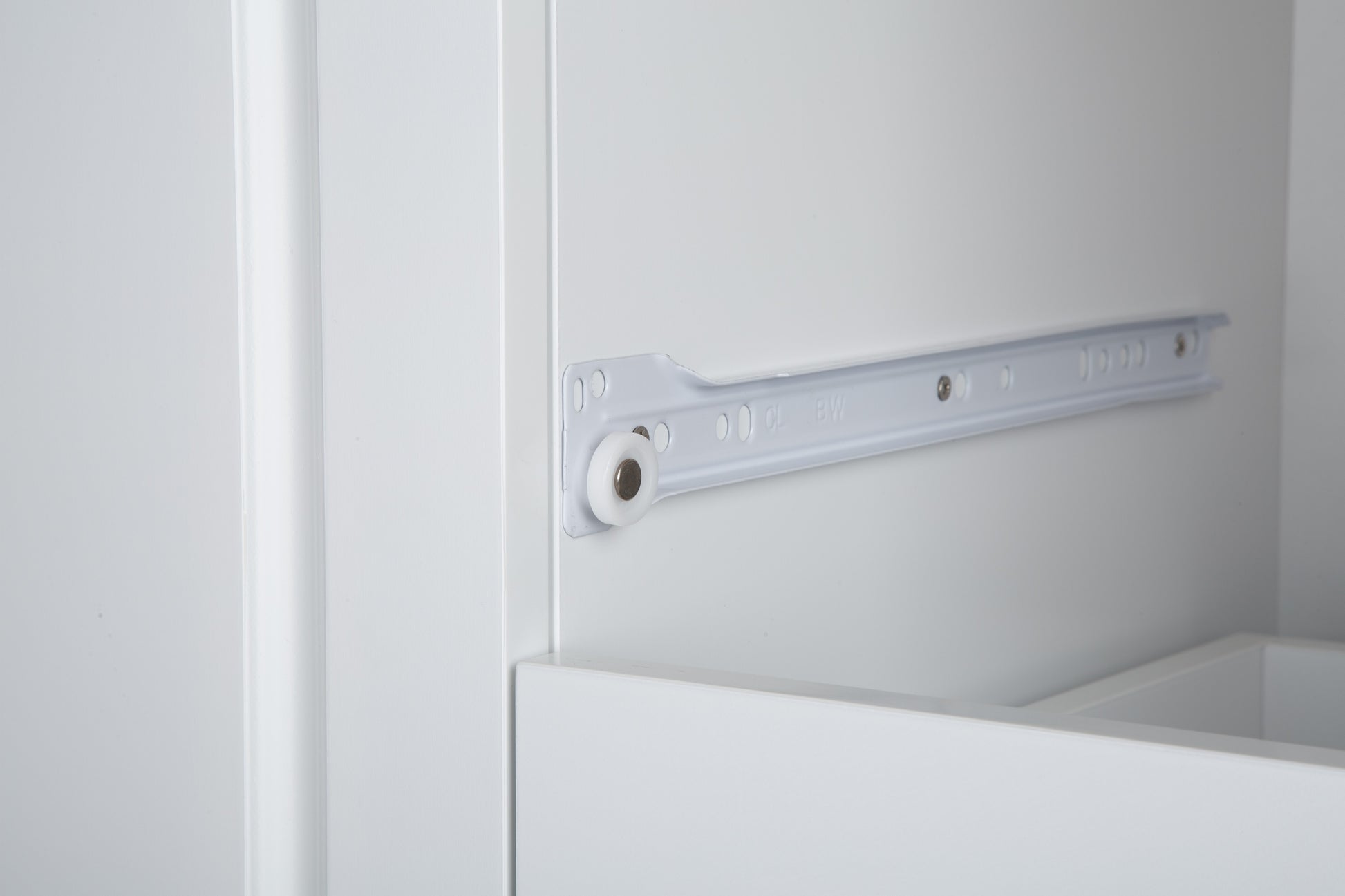 There are 3 spacious drawers with silver metal handles on the kitchen island, which can hold daily tableware, and one big storage cabinet with silver metal handles that can be opened left and right, and there is plenty of space to store kitchen goods.