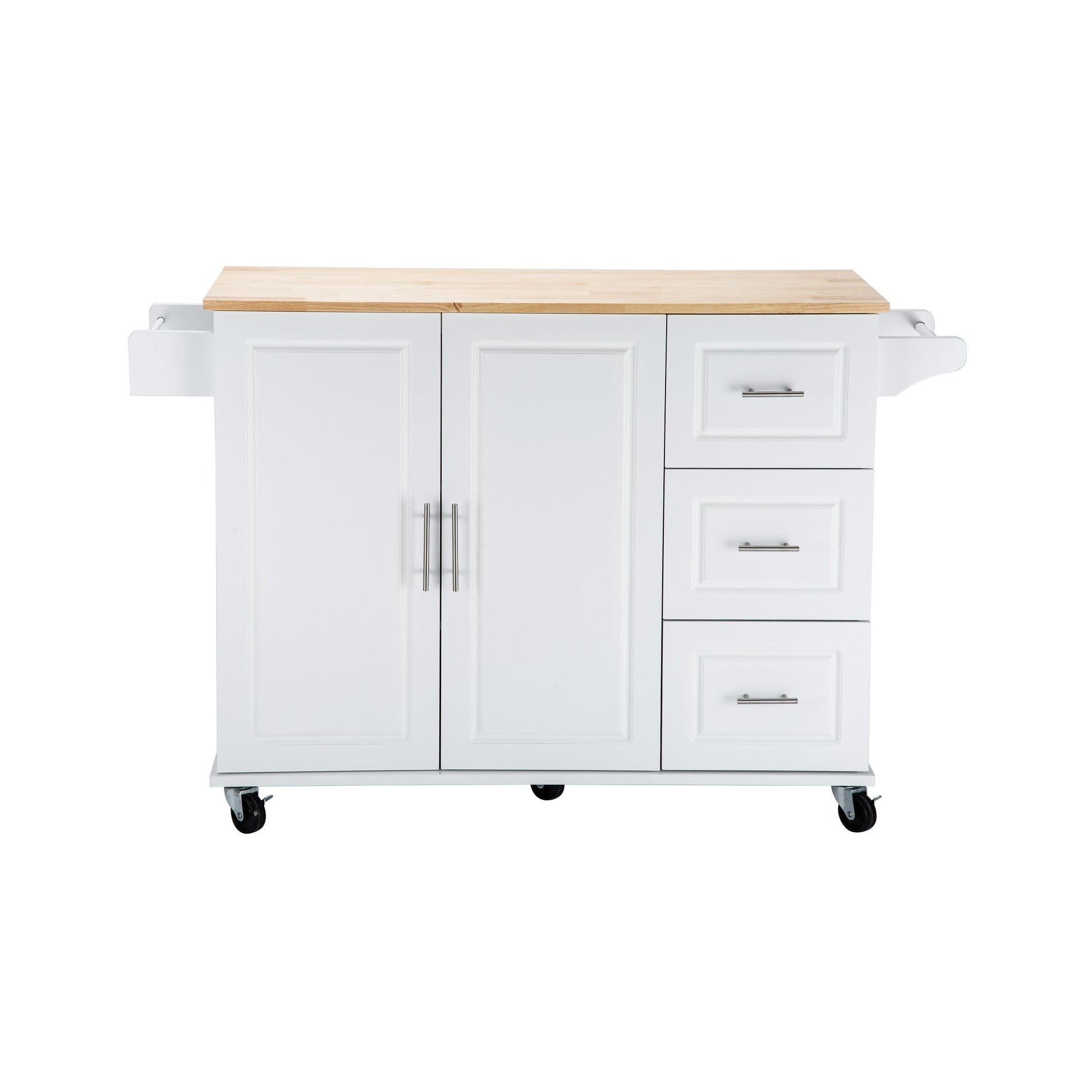 3 Drawers Rubber Wooden Top Utility Kitchen Cart with Adjustable Shelf- White