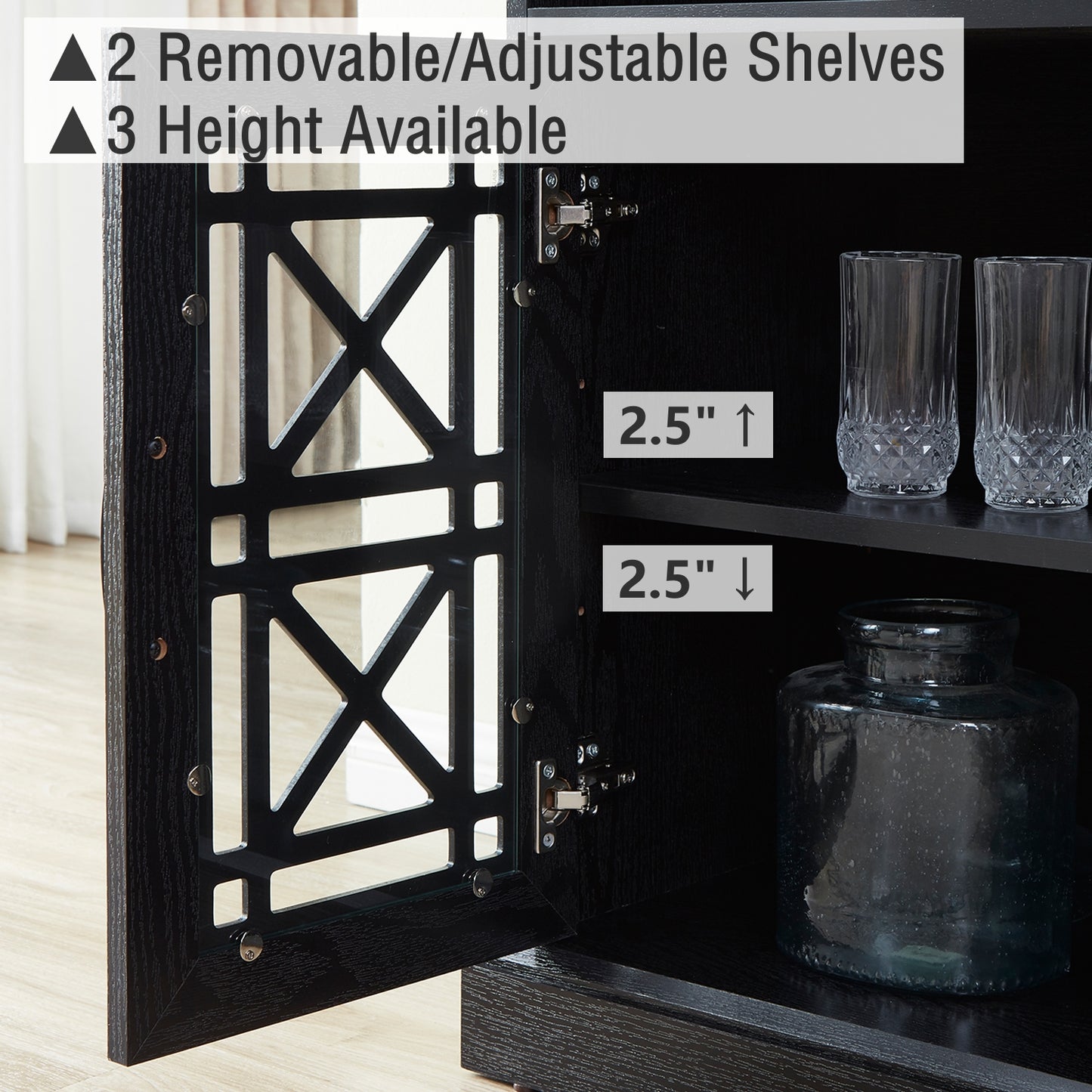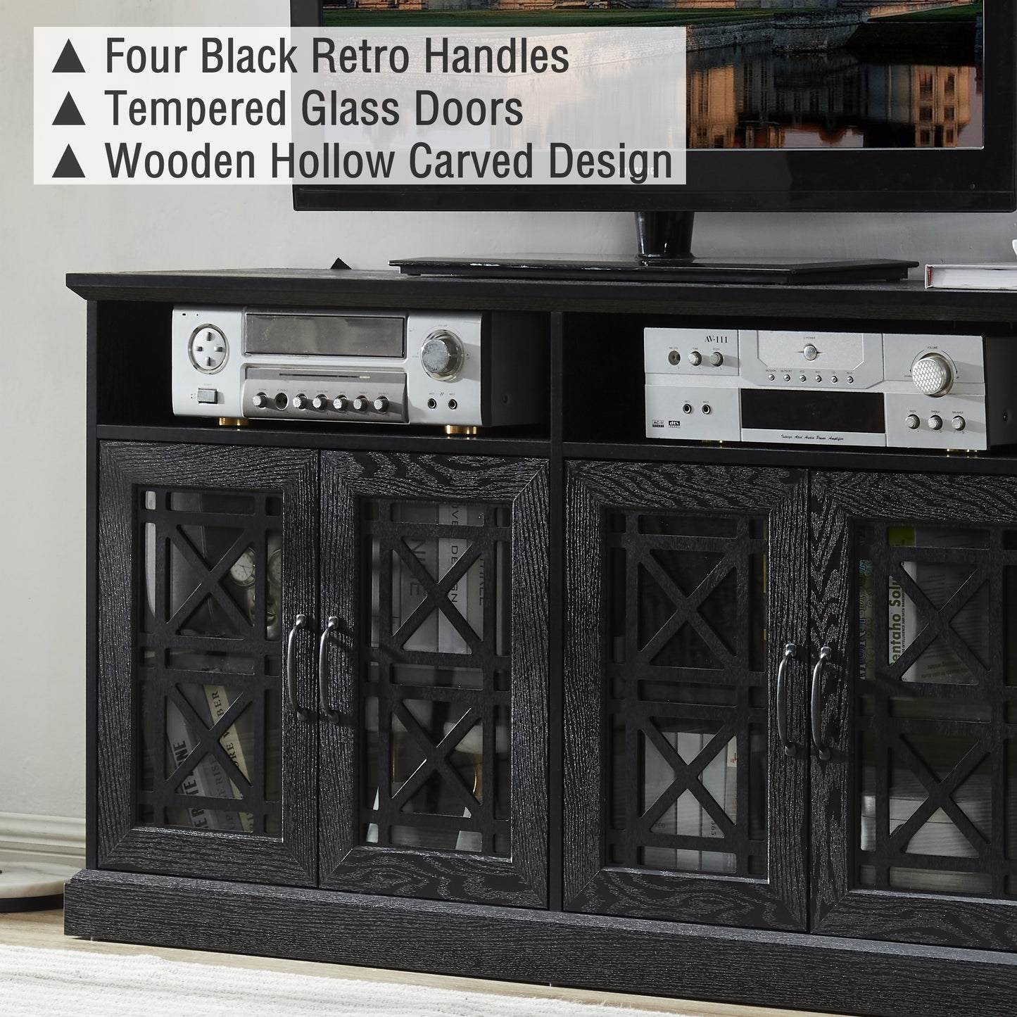 Not only does this TV console storage buffet cabinet offer practical storage solutions, but it also ensures functionality. The cable management system keeps your cords organized and tangle-free, creating a clean and neat entertainment setup. The sturdy construction and anti-tip device provide stability and safety, giving you peace of mind.