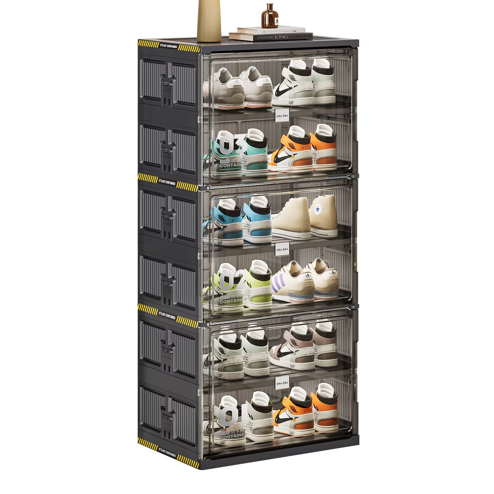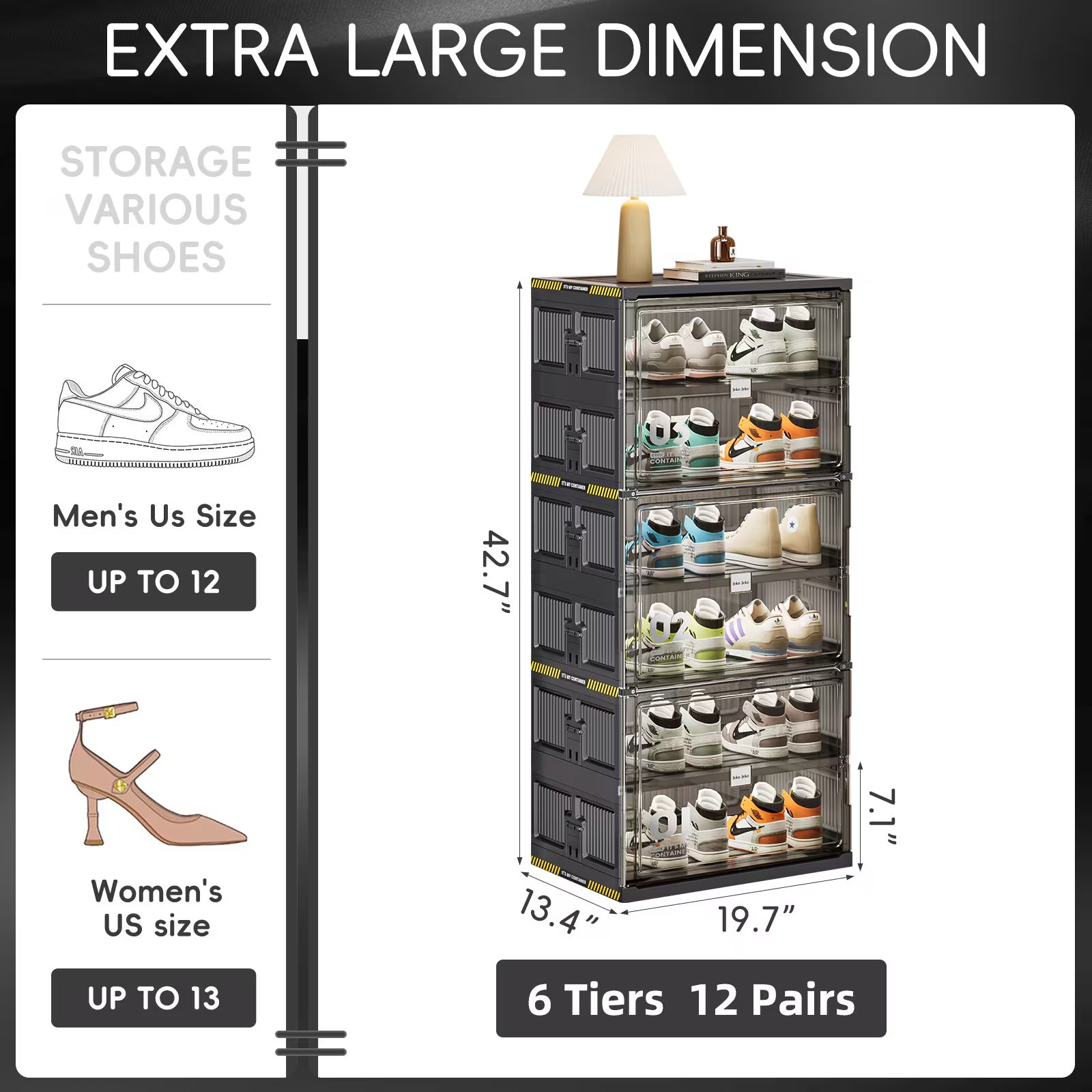 6 Tiers 12 Pairs Hard Plastic Shoe Storage Organizer Cabinet For Entryway, Large Stackable Collapsible Sneaker Shoe Box Organizer For Closet, Portable Folding Shoe Cabinet With Doors, Black