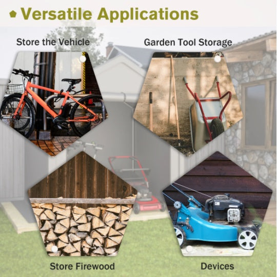 Versatility: Beyond serving as a shelter for your cars, this carport has multiple uses. It can be transformed into a storage area for gardening tools, outdoor equipment, or bicycles. With the tightening device, you can attach additional accessories or partitions as needed, customizing the space according to your requirements. It can also act as a covered area for outdoor activities, providing shade or protection from rain. The tightening device ensures stability and functionality in all these different applications.