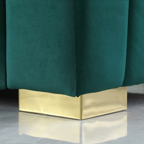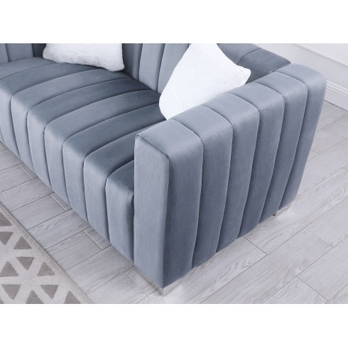 A modern channel sofa take on a traditional Chesterfield, the sofa is a statement - making piece of beautiful design. Rich velvet is chanelled on both the inside and outside of the frame, a beautiful design detail that can be seen from any angle in a room. Single "bench" cushions allow for comfortable multi person seating without cushion separations
