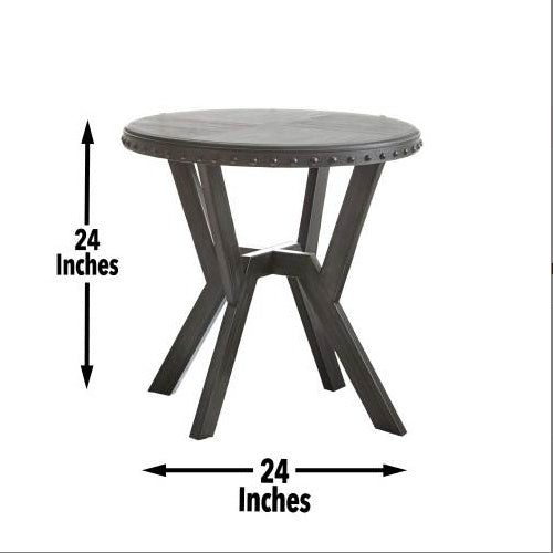 - Styling features include metal table rim with exposed rivet look and geometric metal base that gives collection an archictectural feel