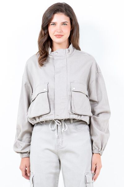 American Bazi Full Size Drawstring Hem Cargo Pocket Cropped Worker Jacket Plus Size