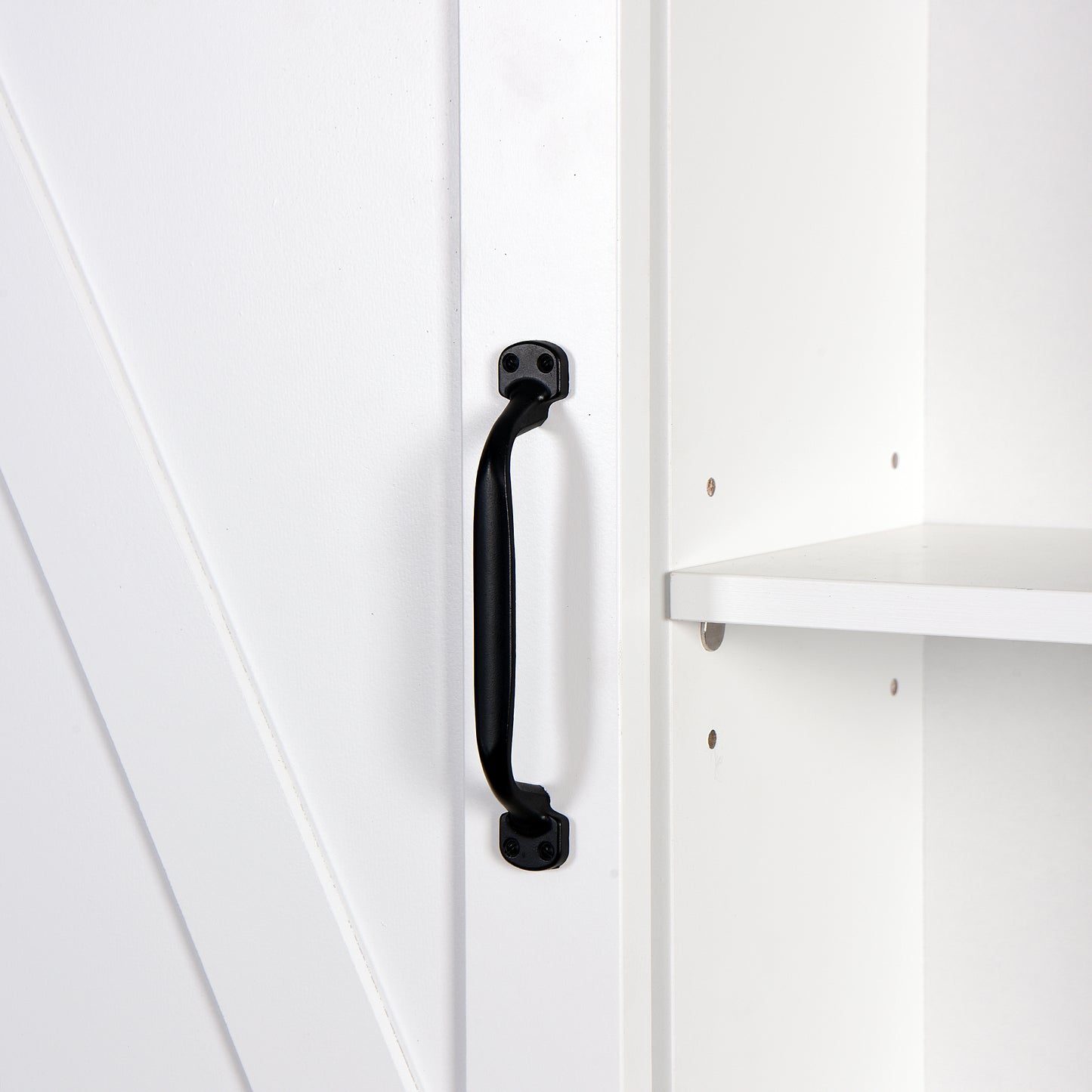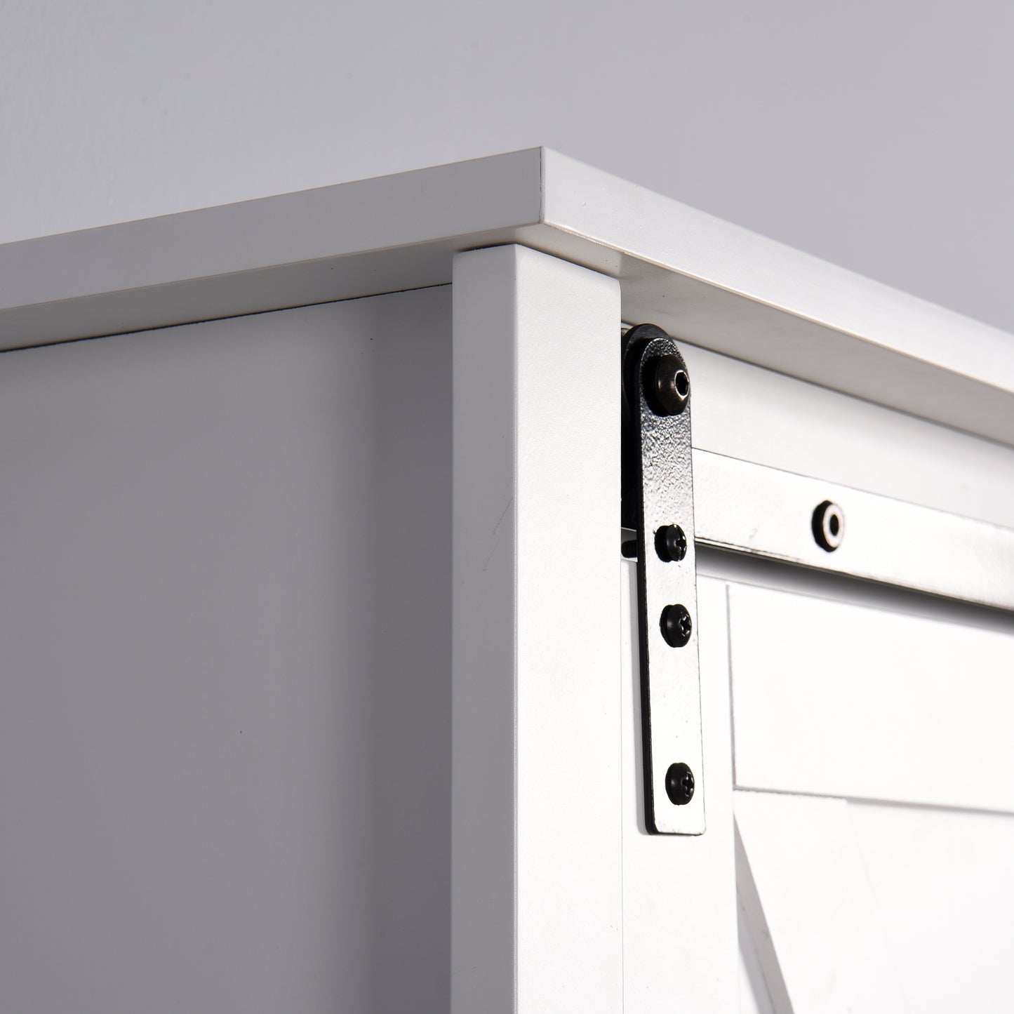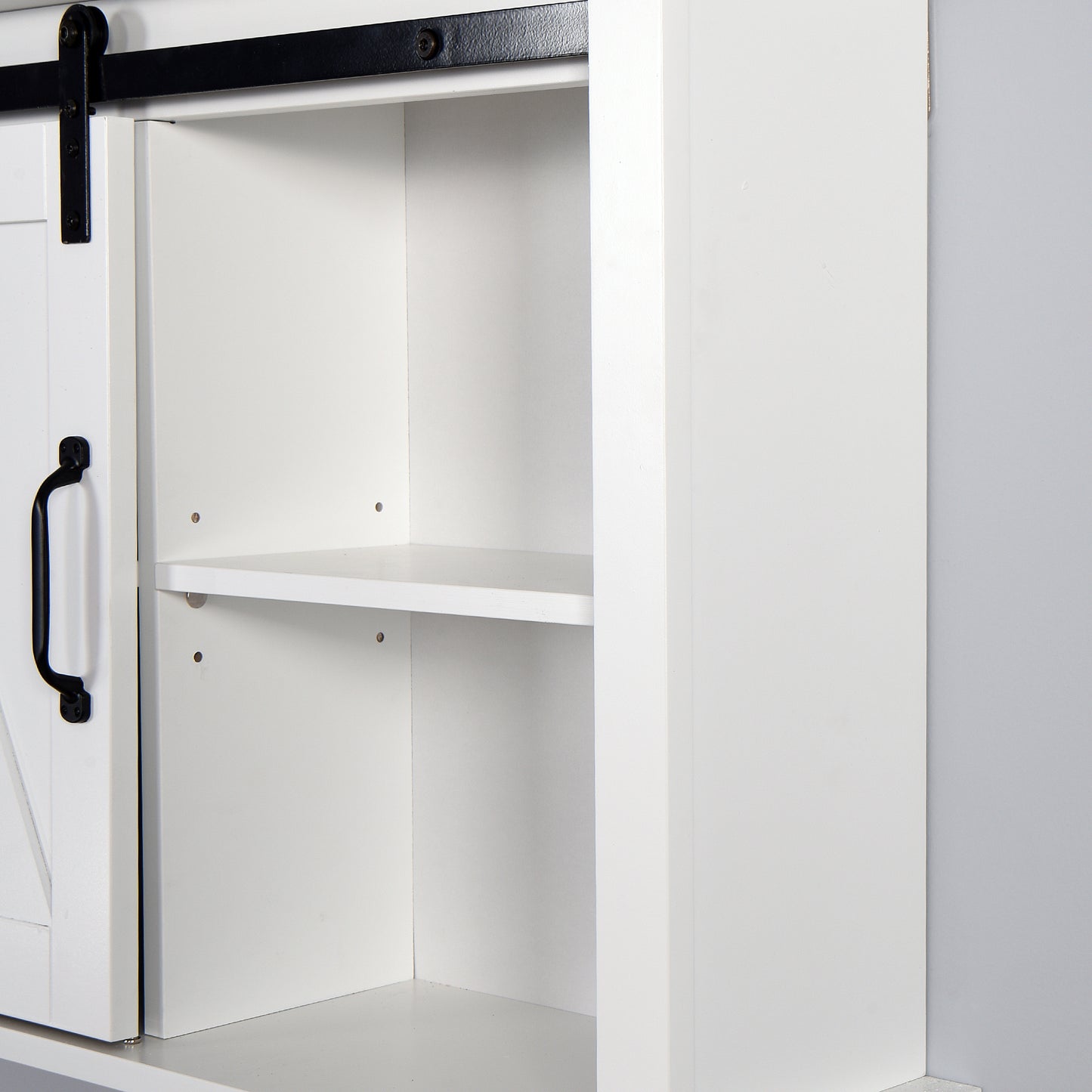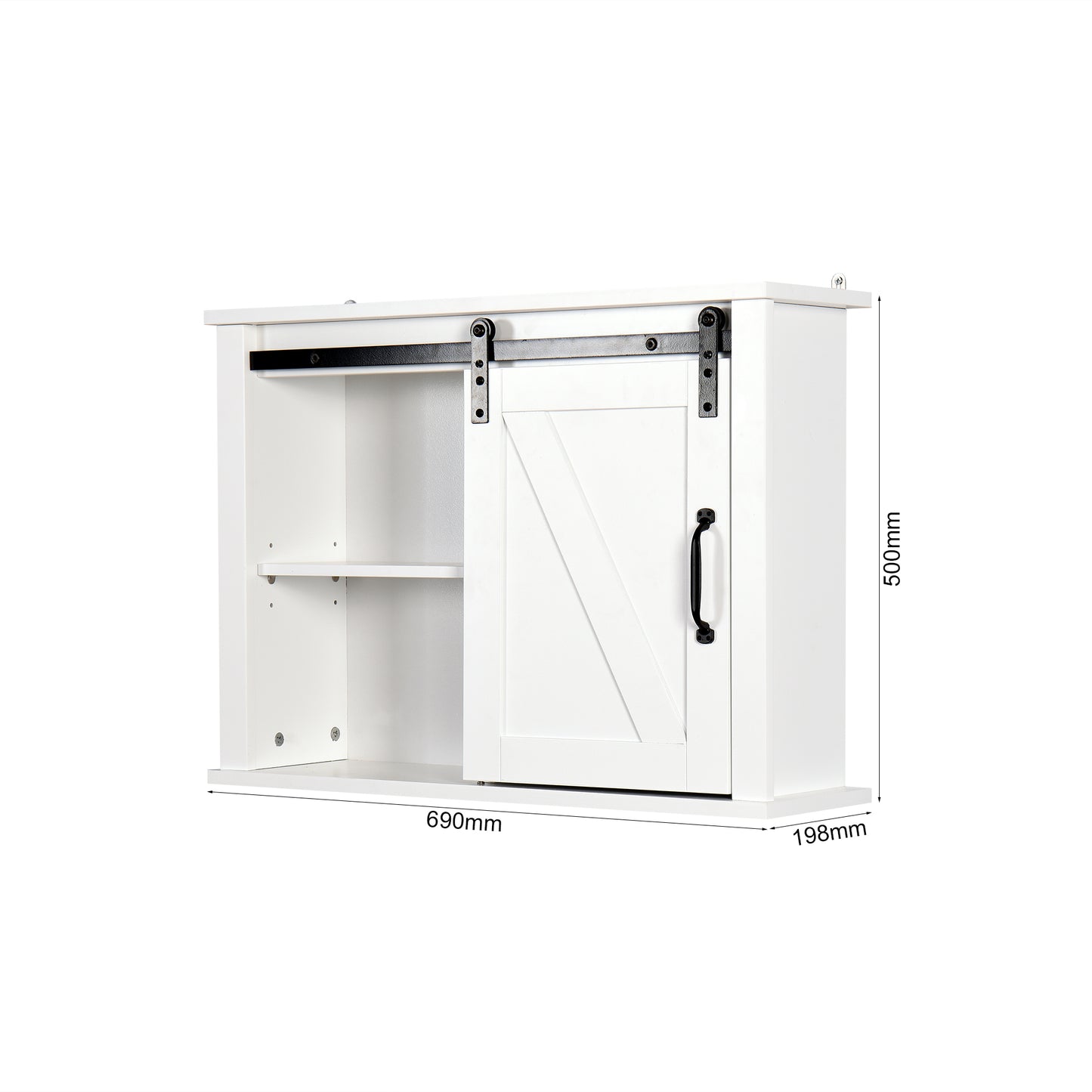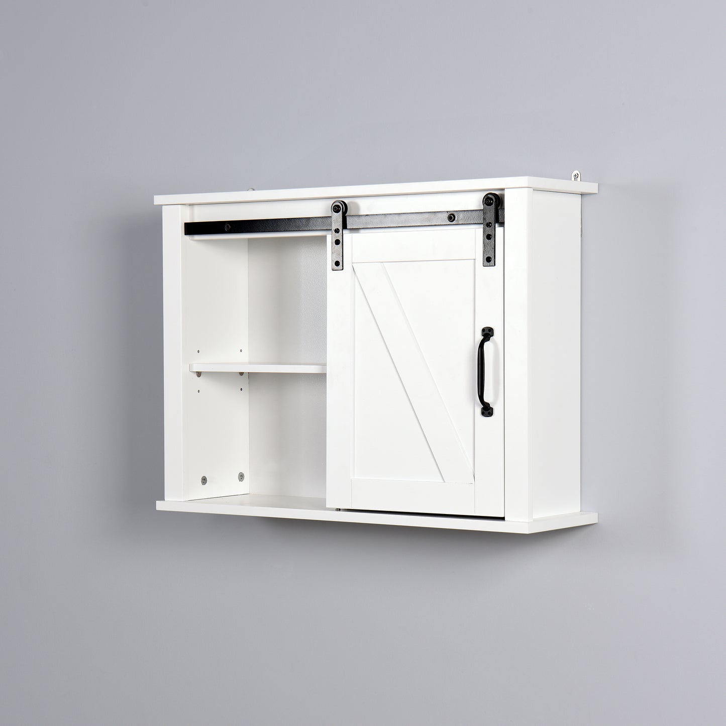 The Wall Storage Cabinet provides function and style with decorative charm. The rustic wooden white-washed finish and sliding barn door add a classic addition to your home decor.