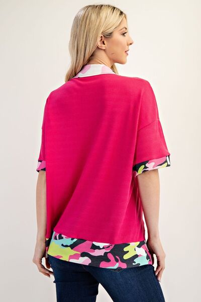 Stand out confidently in this Vibrant Camo Collar Top, where bold fashion meets casual comfort. Crafted from a lightweight waffle knit fabric, this top features a stunning pop-off with eye-catching camo print accents on the collar, cuffs, and hem. The relaxed fit and short sleeves provide an effortlessly chic look, while the side slits add an element of versatility for layering or movement.