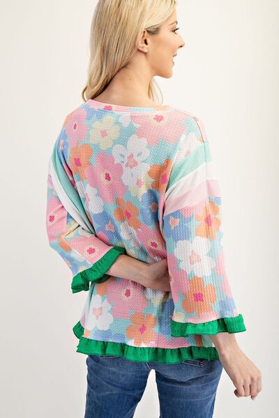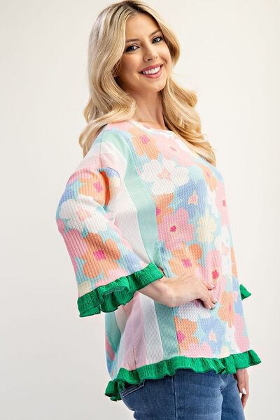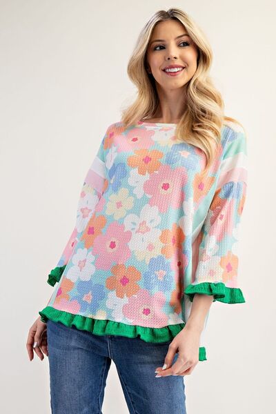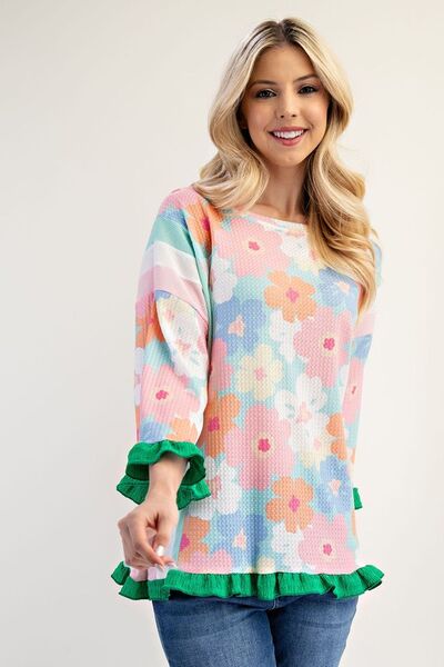 Celeste Full Size Floral Ruffle Hem Round Neck Blouse Plus Size