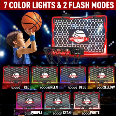 7 color LED lights and dual flash effect: Enhance the excitement of each basket with our mini basketball hoop, equipped with 7 vibrant LED lights (red, orange, yellow, green, cyan, blue, purple) and 2 dynamic flashing modes. Witness each score illuminating the room and adding excitement to every gaming process.