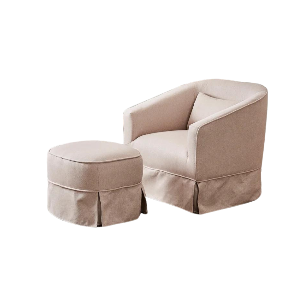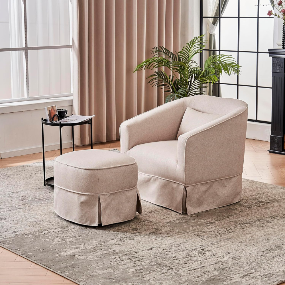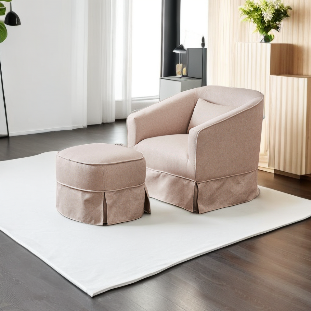 With a generous seat height, this chair and ottoman provide ample space for relaxing or entertaining. The iron legs provide a sturdy and modern base in a sleek black finish. The beige linen upholstery adds a touch of sophistication and texture to the set.