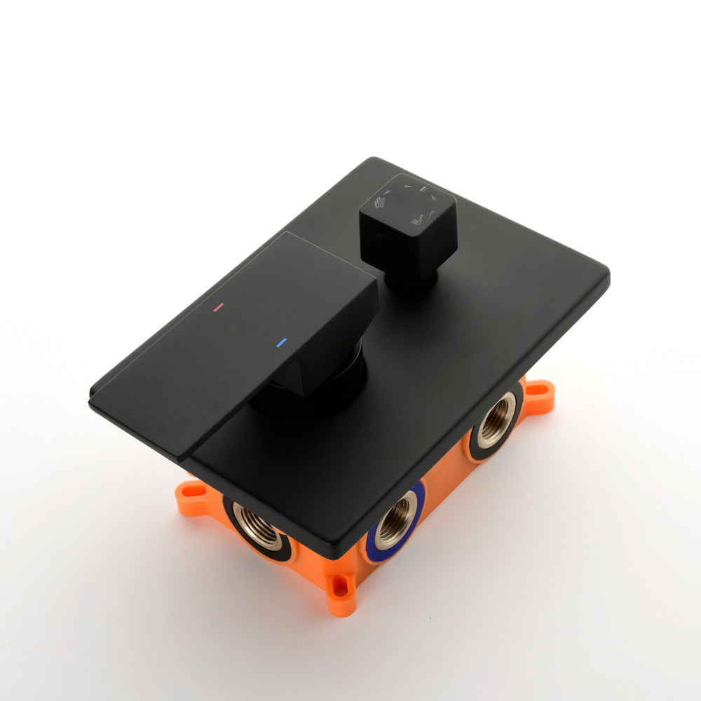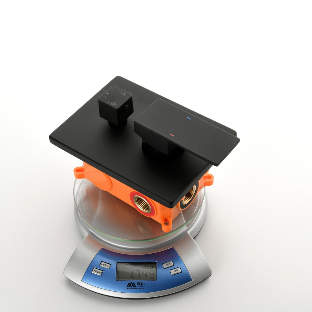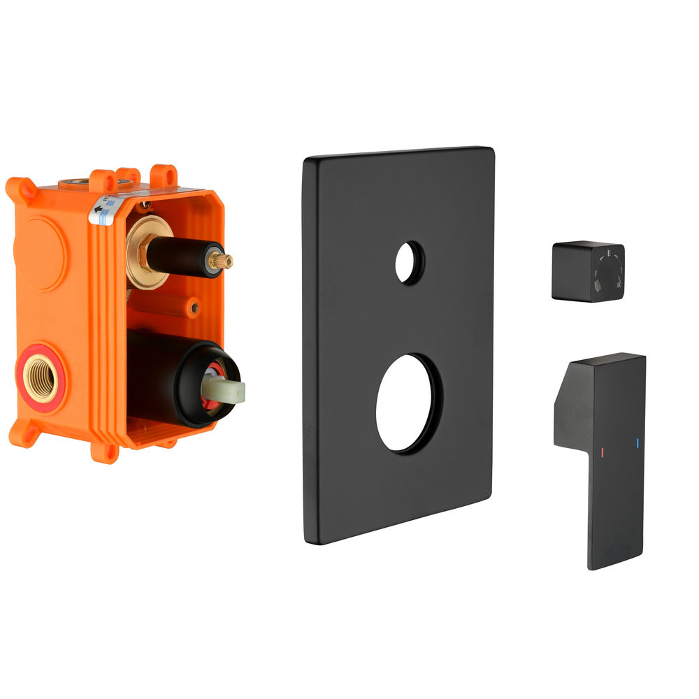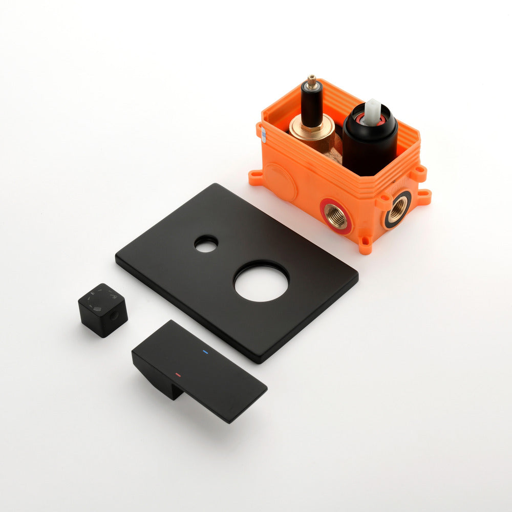 This complete set includes everything you need for a fully functional and stylish shower space, including a shower head, hand shower, hose, valve trim, lever handles, and a niche for storage or decorative purposes.
