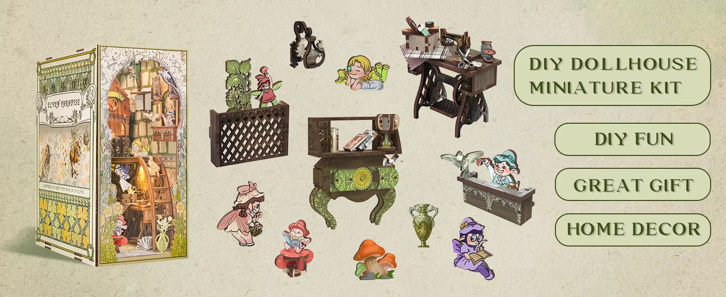 CuteBee 3D Wooden Dollhouse Elven Paradise Handmade Craft With LED Night Light Building Model Toys Book Nook Kit