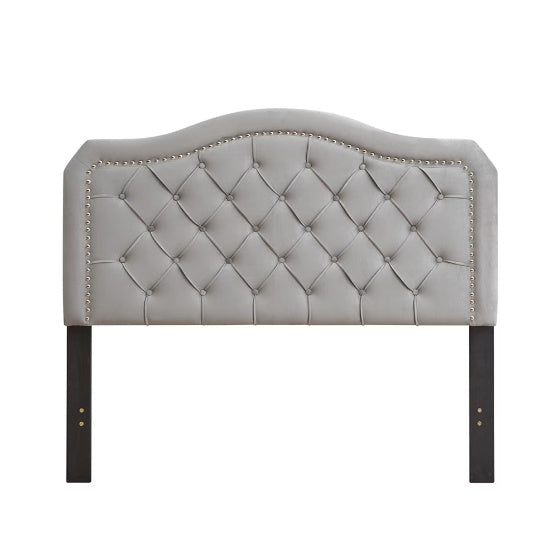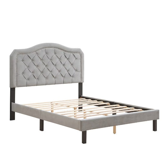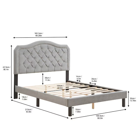 Product Name: Fabric Bed Buttons, Curved Design Quilted - Strong Wood Slatted Support - Easy to Assemble - Grey Velvet - Platform Bed - Queen Bed