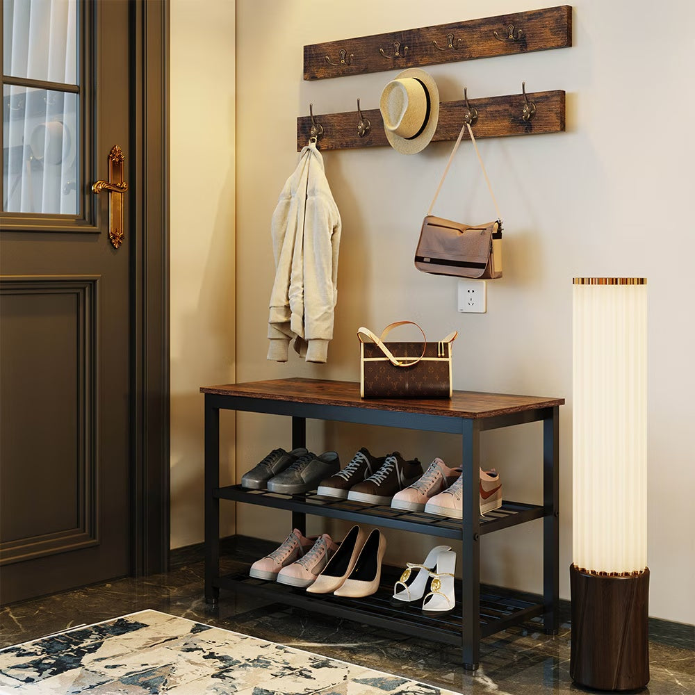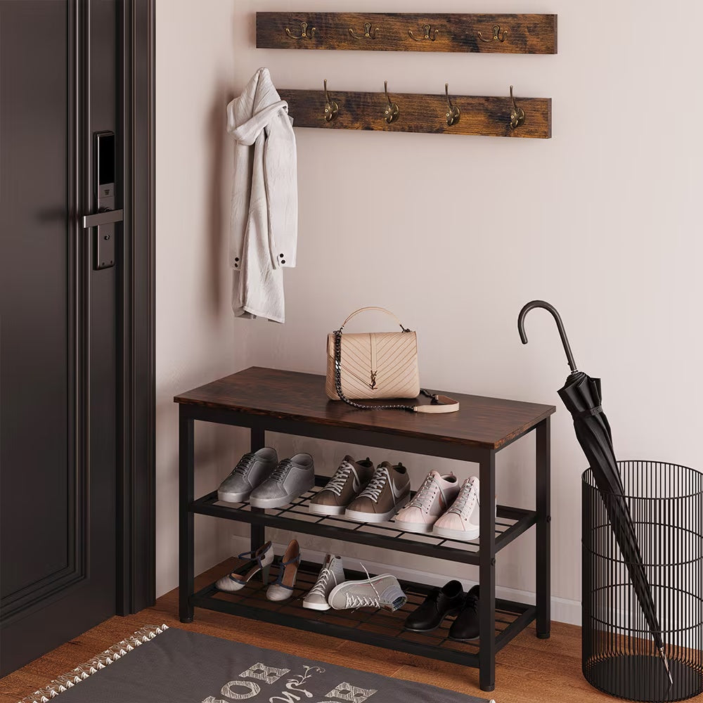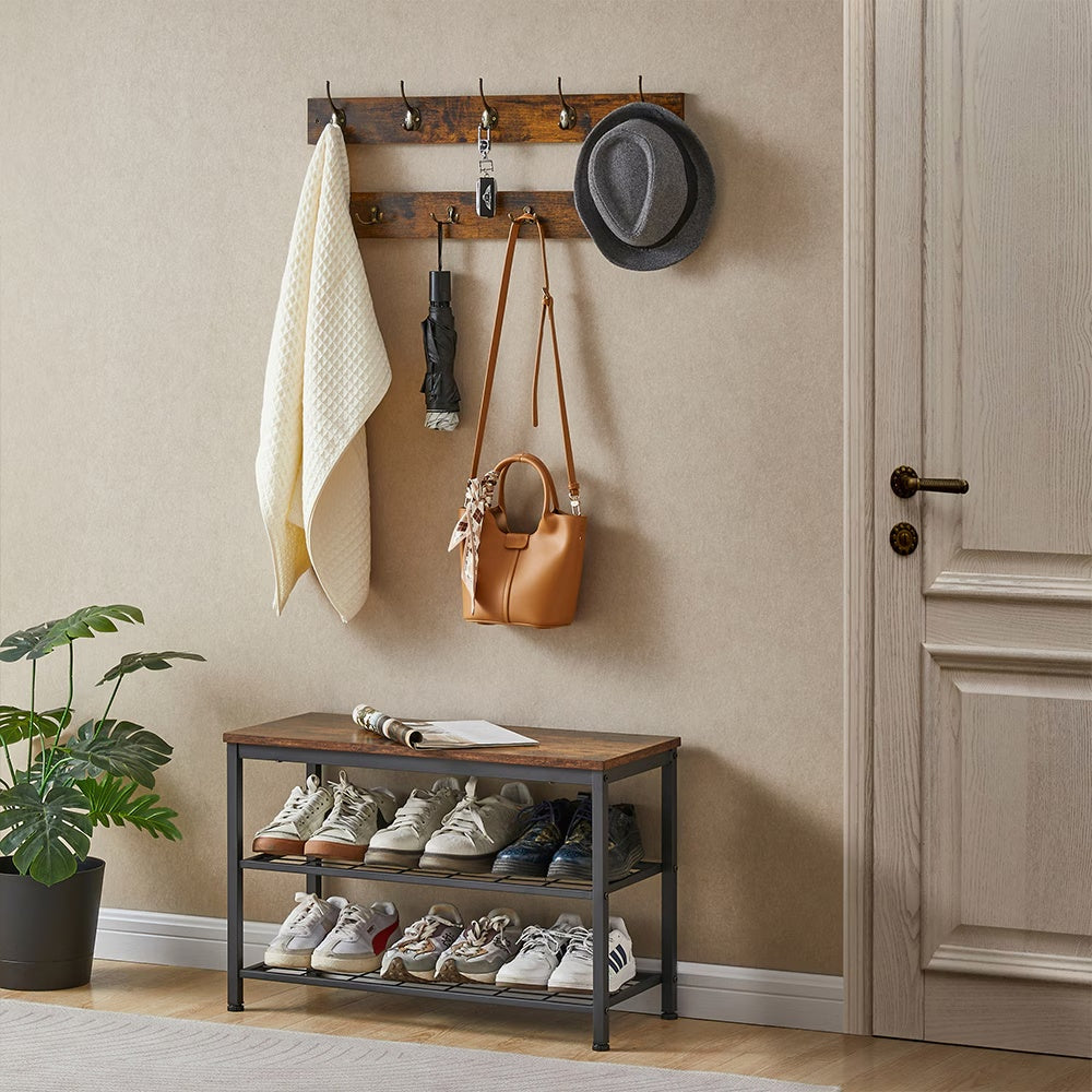 - Coat hooks in 2 rows together with a sturdy shoe bench, this combination will work together in your entryway to conquer the chaos once and for all.