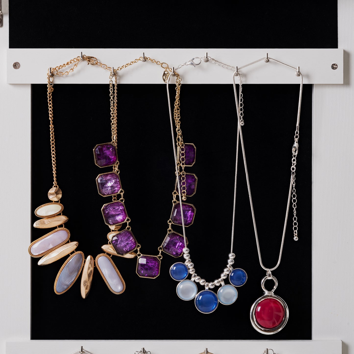 Luxurious interior: Stylish velvet interior protects jewelry from scratches, locks and keys ensure safety. It includes 22 necklace hooks, 2 cubes, 3 lined shelves, and a bracelet rod, and plenty of room for rings and earrings.·