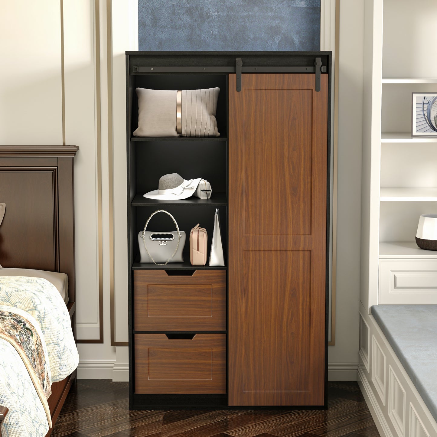 Freestanding Contemporary Wooden Closet Cabinet with Hanging Rod- Black+Brown