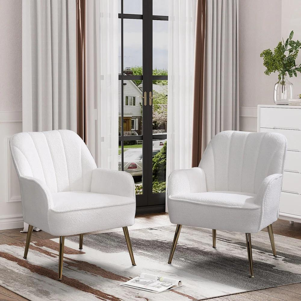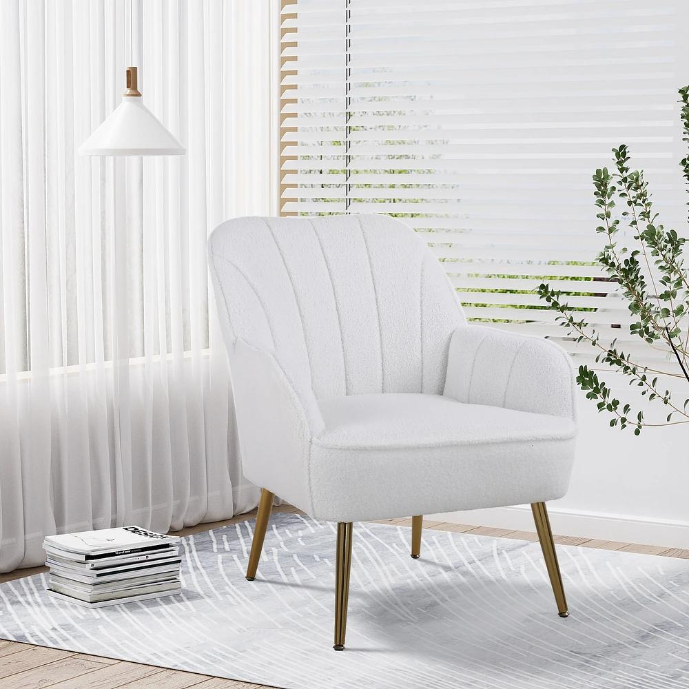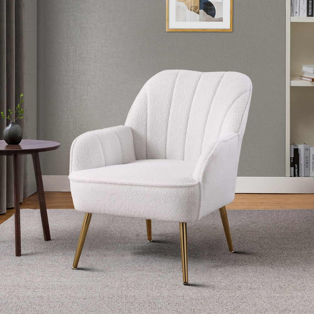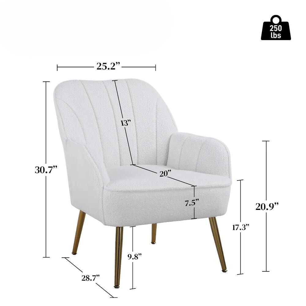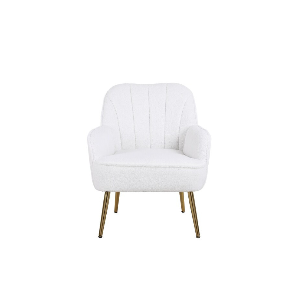 Made in soft ivory teddy fabric, this chair offers a cozy and inviting texture that complements a wide variety of interiors. Its plush seat and ergonomic backrest provide excellent support, making it perfect for lounging in the living room, bedroom, or home office. This accent chair features sleek, gold-finished legs that add a touch of sophistication and glamour to its overall design.