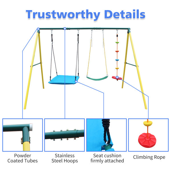- Let Children Play Safely: Our swing set features A heavy steel based A-frame that provides solid support for play. Supports kids weighing up to 100lbs each,up to 300lbs in total , children can rest assured to sit on it, experience the feeling of flying, have a happy childhood!