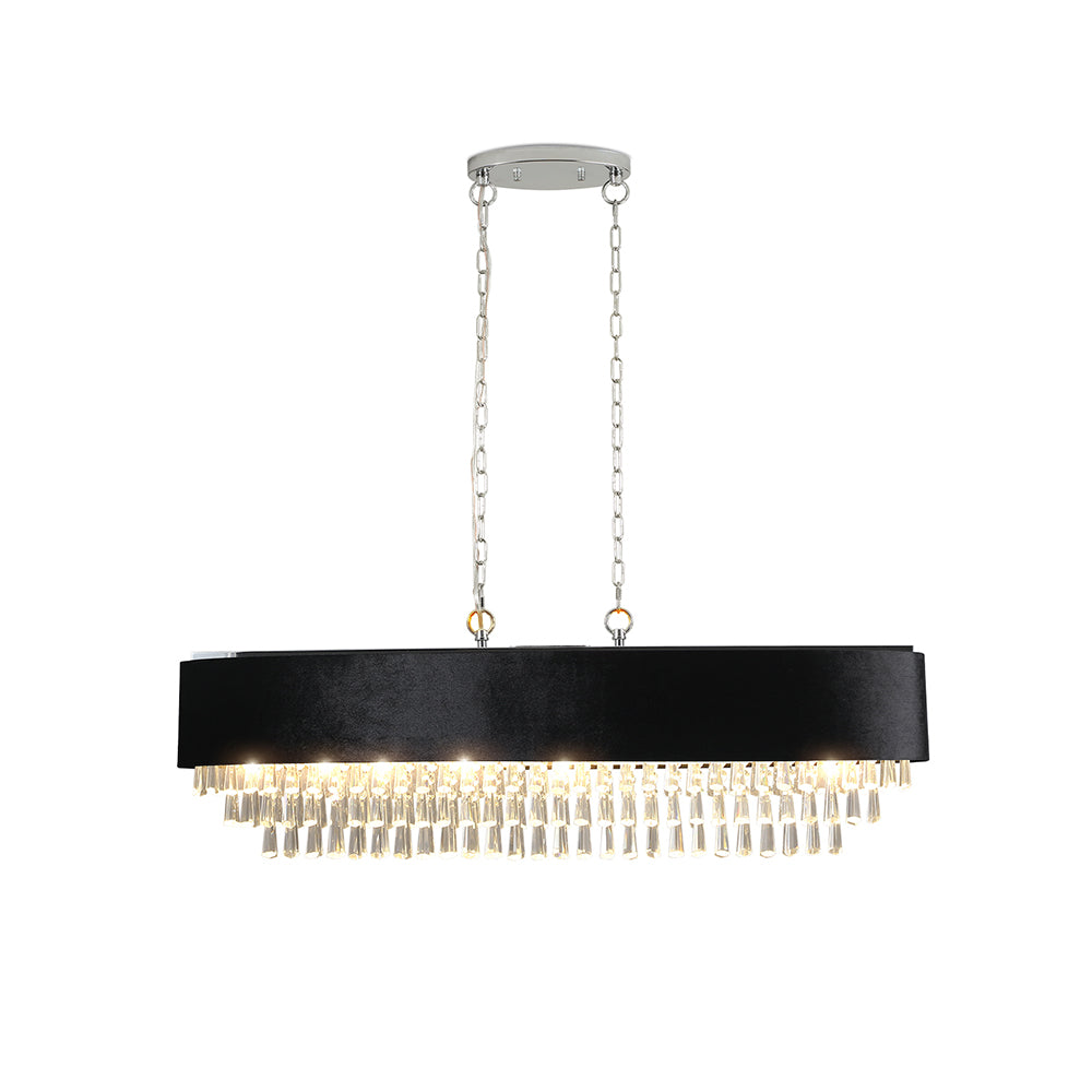 Constructed with premium materials, including stainless steel, K9 crystal, and black imitation velvet, this chandelier exemplifies durability and luxury. It comes equipped with three 11.8-inch and a 9-inch boom, allowing you to adjust the height according to your room's dimensions and personal preference.