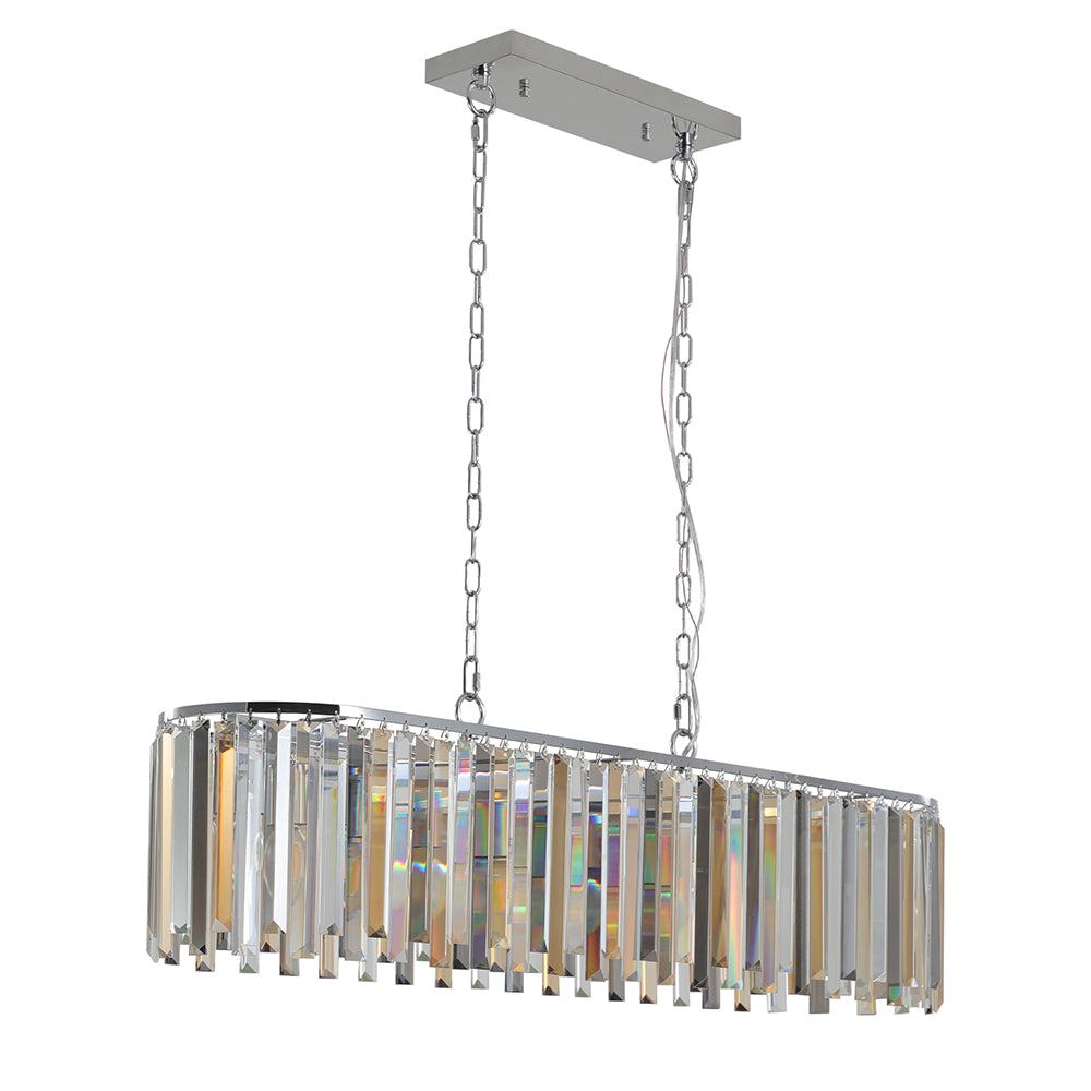 A remarkable fusion of metal and crystal that brings an artistic atmosphere to any space. With its simple yet captivating shape, this chandelier effortlessly decorates the entire room while casting a radiant glow. It is the ideal decor choice for those seeking a touch of luxury, elegance, and a modern industrial retro design that adds a vibrant pop of color to your surroundings.