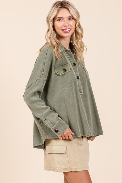 Mittoshop Mineral Wash Waffle Knit Collared Neck Henley Top