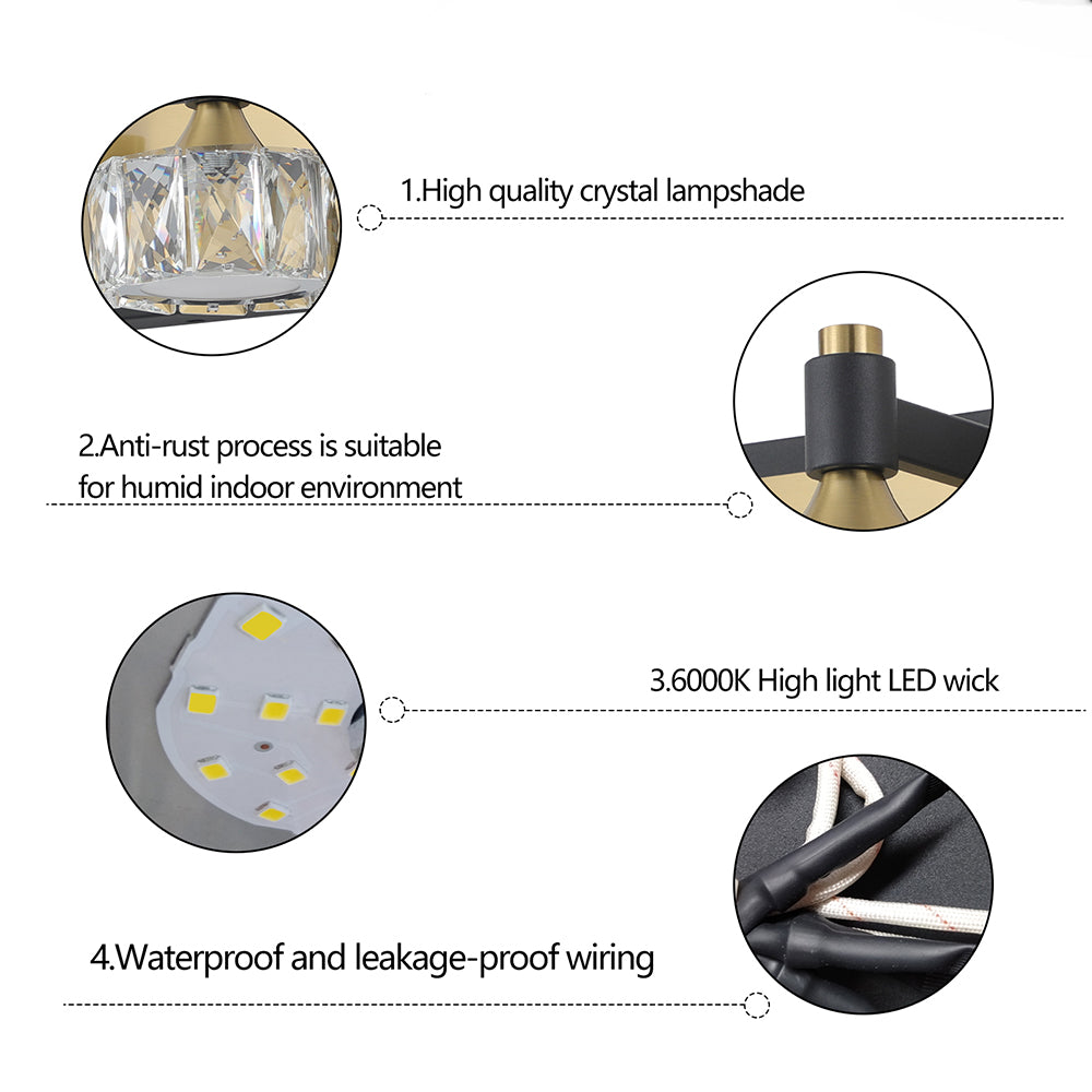 The black copper lamp body, combined with the crystal lampshade, creates a distinctive and eye-catching look. The black and brass combination is a popular design trend, adding a touch of modernity and sophistication to your bathroom decor.