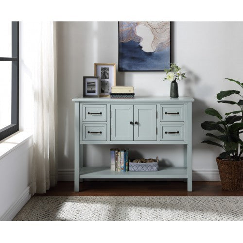 Description Effortlessly fill in that blank space in your home with this console table, designed to fit all of your needs and more. Crafted with a classic vintage appearance, this table comes complete with two front facing cabinet doors that open to reveal a spacious interior, perfect for stowing away your larger necessities and keeping them out of sight. The 4 matching compact side drawers minimize clutter, offering plenty of space to hold smaller items such as keys or mail while the spacious bottom shelf is the perfect place for storage baskets, shoes and more. Crafted with thick Pine and MDF wood slabs and accented with quality iron handles, this piece is manufactured for quality and exudes a high-end appeal that will leave your guests talking. Highlights [High Storage Capacity] – With built in shelving ranging from the front double doors to the 4 accent side drawers, users will have plenty of space to store their belongings and avoid letting clutter accumulate on the console table. [Modern Vintage Design] – Aspects of both modern and vintage come together to create this unique piece, featuring farmhouse inspired wood frame detailing on the outer drawers with contrast from the iron handles for heightened appeal [Manufactured for Quality] – Thick slabs of Pine and MDF wood are expertly crafted for a quality build with solid base legs. Features a veneer reinforced upper surface to prevent wear after prolonged usage. [Eye-catching Versatility] – Crafted for versatility, this piece can enhance a variety of spaces and surrounding decors acting as the perfect piece to bring life into any area of your home that needs it most. Great for entry hallways, dining rooms, bedrooms and more. [Easy Assembly] – Manufactured for easy assembly, a single person can quickly put this console table with the straight forward step by step instructions with tools included. Large cabinet weight capacity: 110 lbs, table surface weight capacity: 220lbs, Accent drawer weight capacity: 33lbs. Advantages 1. Toally new item 2. We produce this item in a big factory which has a low damage and defective rate. 3. Compared with the same quality, the price is competitive.