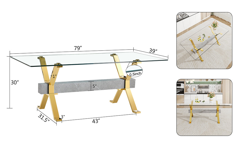 This dining table is made out of tempered glass material with elegant gold electroplated metal that exudes modernity and style, creating a visually appealing centerpiece in your dining room.