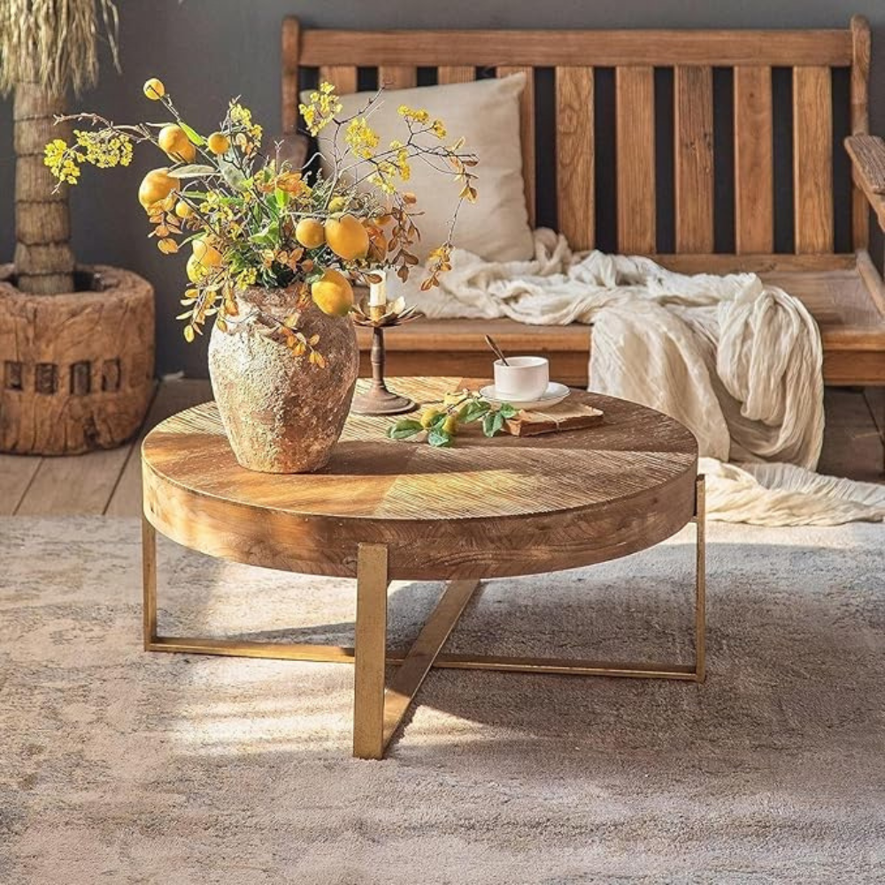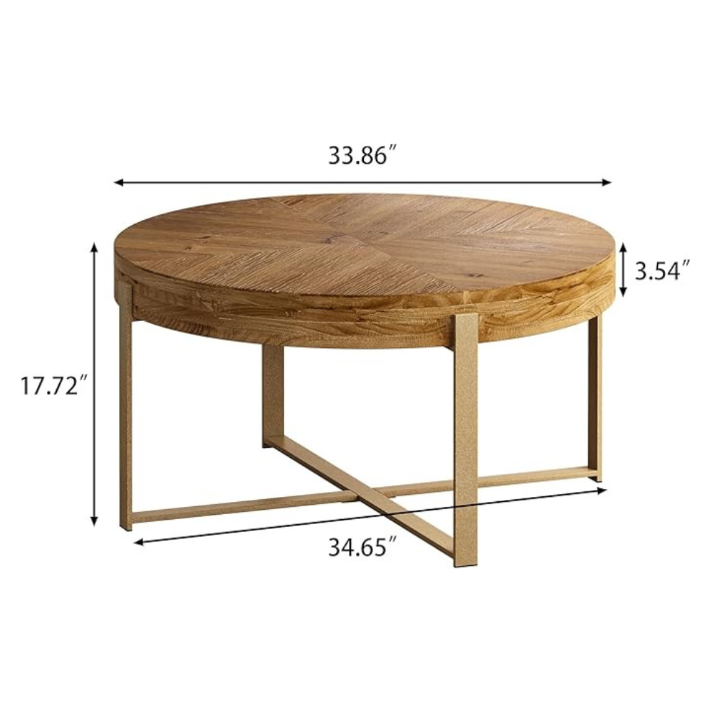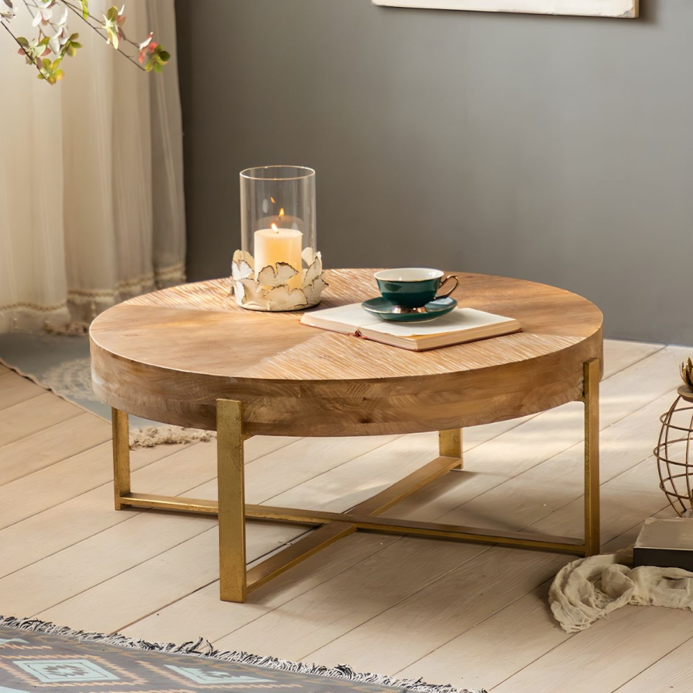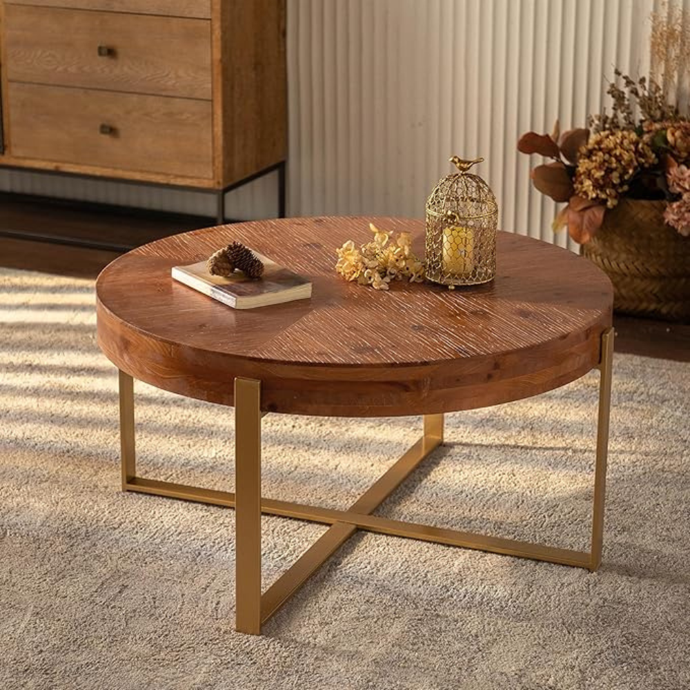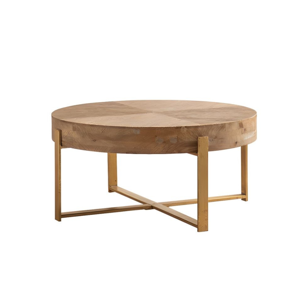 Modern Retro Coffee Table with Fir Wood Top and Gold Cross Legs