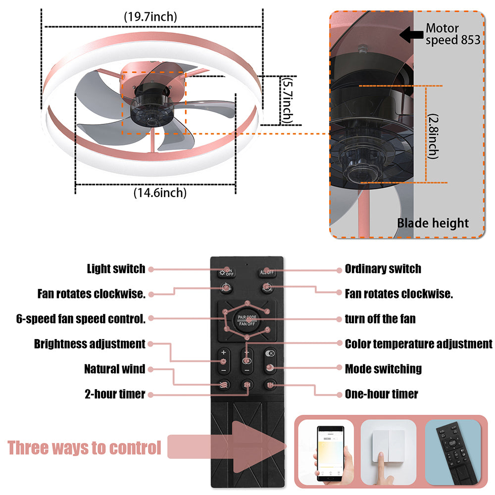 Modern Slim Ceiling Fan with Dimmable LED Lights - Pink