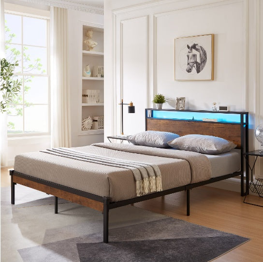 Queen Size Metal Platform Bed Frame With Wooden Headboard And Footboard With USB LINER