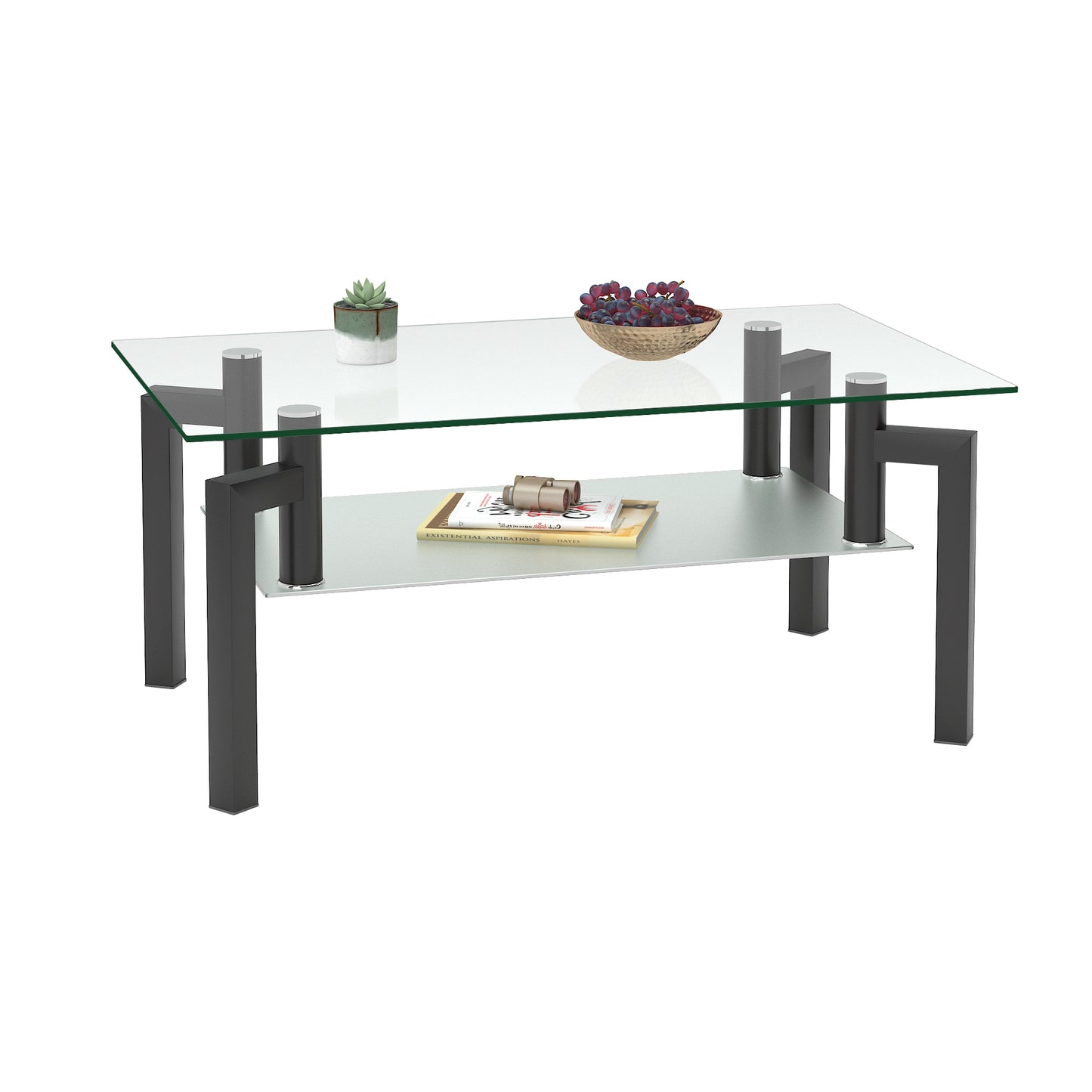 Rectangular Double Layer Tempered Glass Coffee Table with Metal Legs- Clear Glass+Black