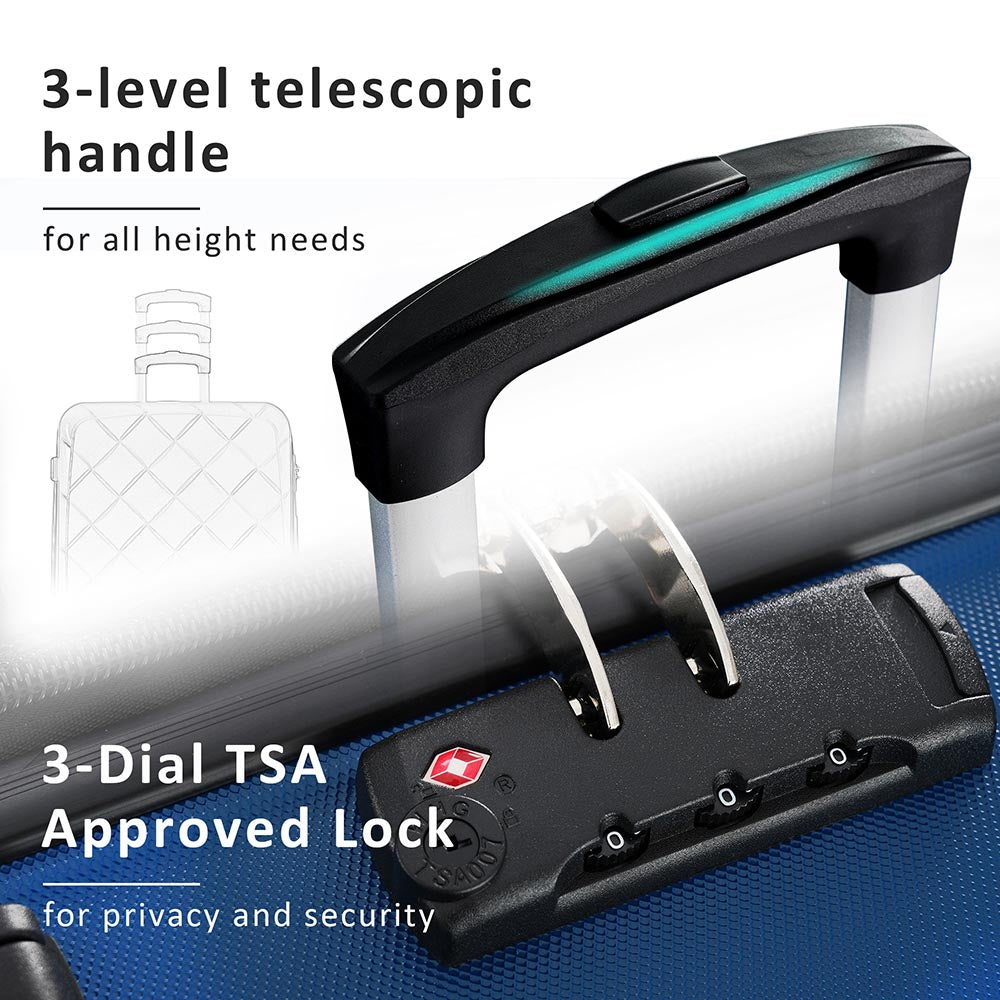 The TSA-approved combination lock ensures the security of your belongings while facilitating customs clearance. Maneuvering through various road conditions is effortless with the 4 universal double wheels, providing smooth and flexible movement. The 3-level telescopic handle adjusts to your height, offering maximum comfort and adaptability.