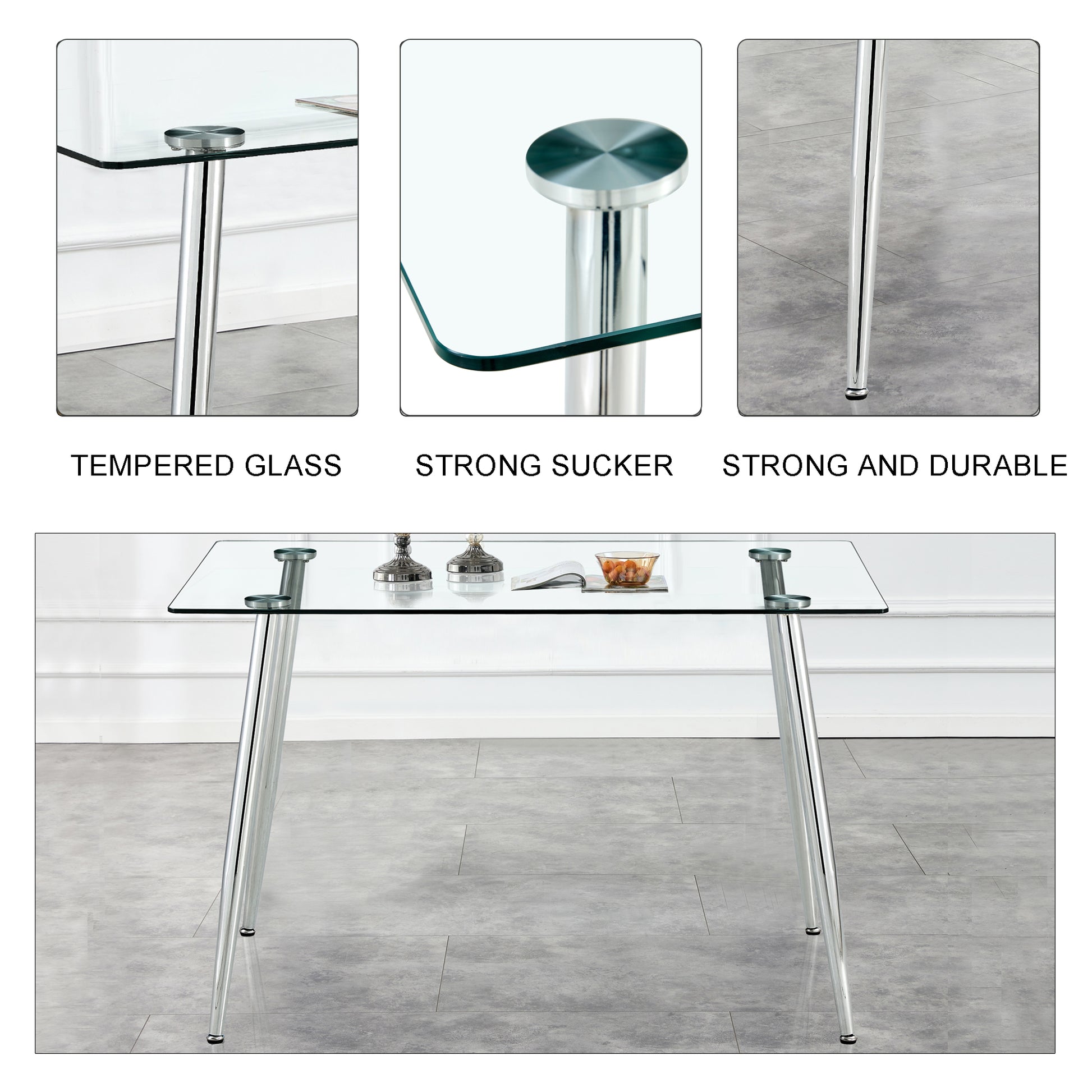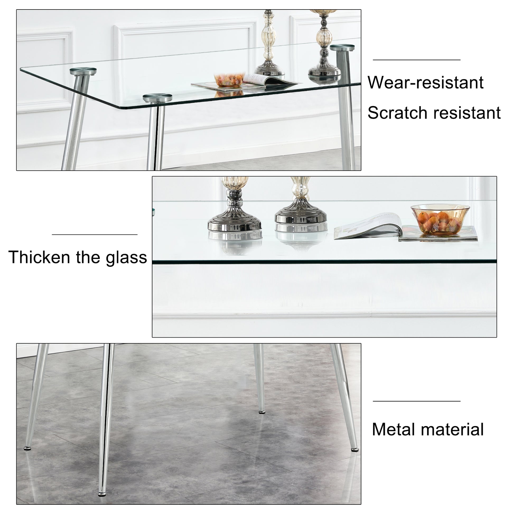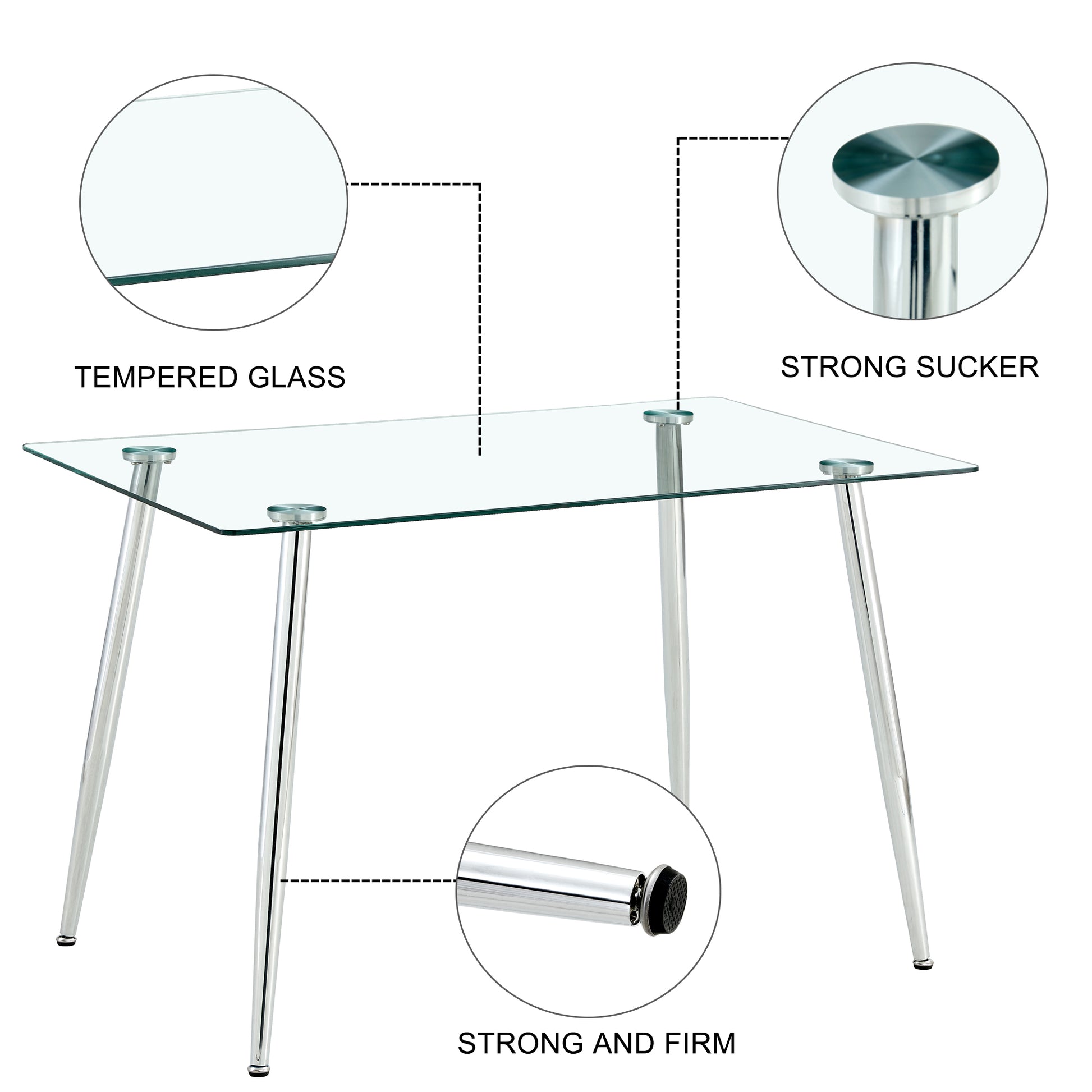 The dining table features a meticulously crafted tempered glass tabletop that not only adds a touch of elegance but also ensures durability. Easily wipe it clean with a damp cloth, maintaining its pristine appearance effortlessly.