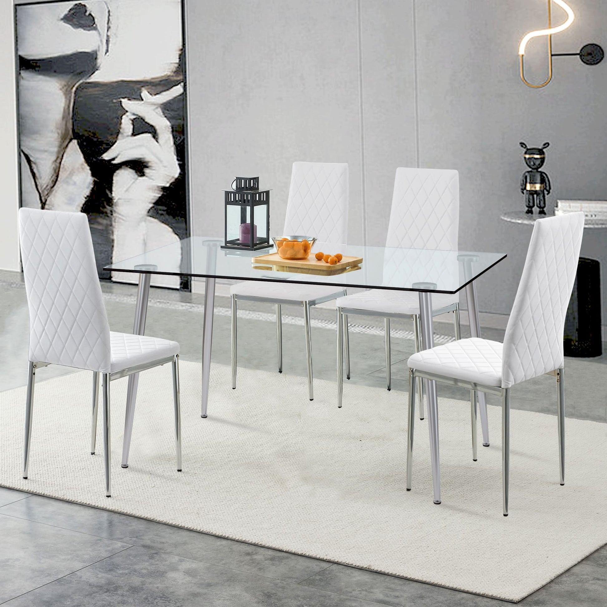 Set of 5 Tempered Glass Dining Table with Dining Chairs- Transparent Table+White Chairs