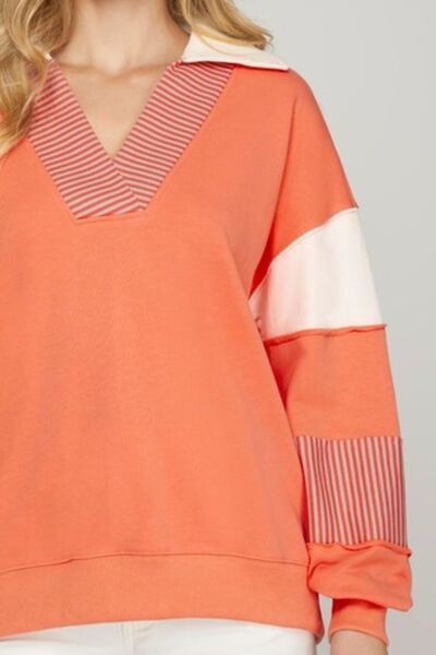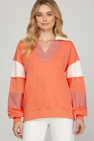 She + Sky Full Size Color Block Sleeve Johnny Collar French Terry Sweatshirt Plus Size