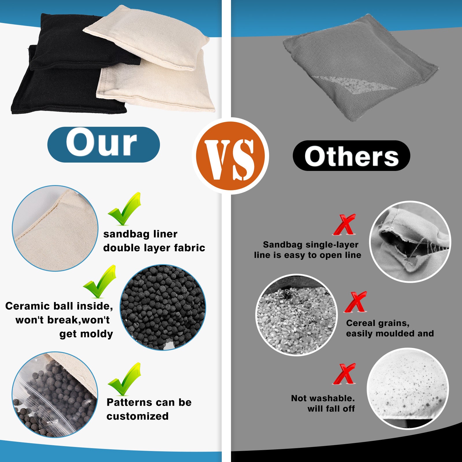 All-weather bean bags: Includes 8 premium regulated size bean bags (4 black + 4 white, no logo), filled with clay particles, no mold, no slag