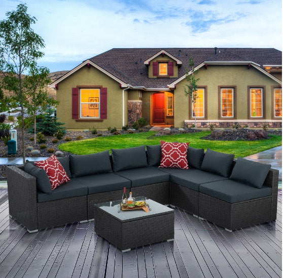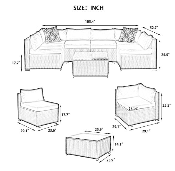 Product Name: Patio Furniture, Outdoor Furniture, Seasonal PE Wicker Furniture, 7 Piece Set of Wicker Furniture with Tempered Glass Coffee Table
