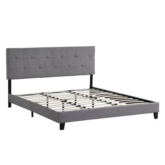 Product Name: King size upholstered platform bed frame, tufted linen head with buttons, no spring mattress required, wooden slats support, easy to assemble, grey