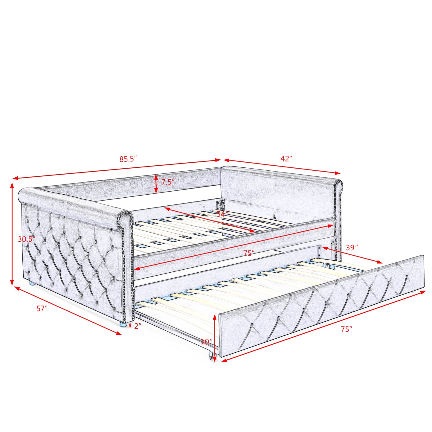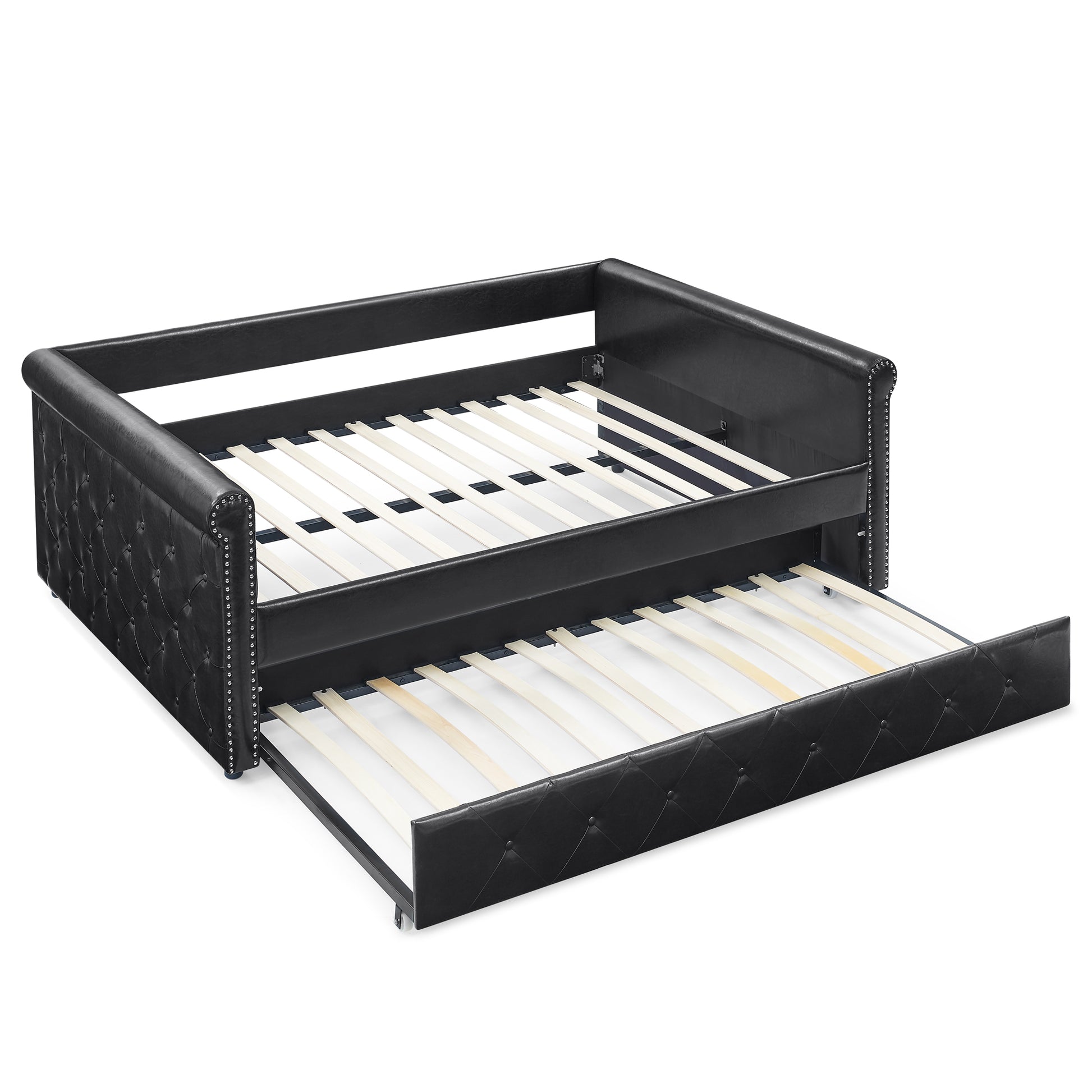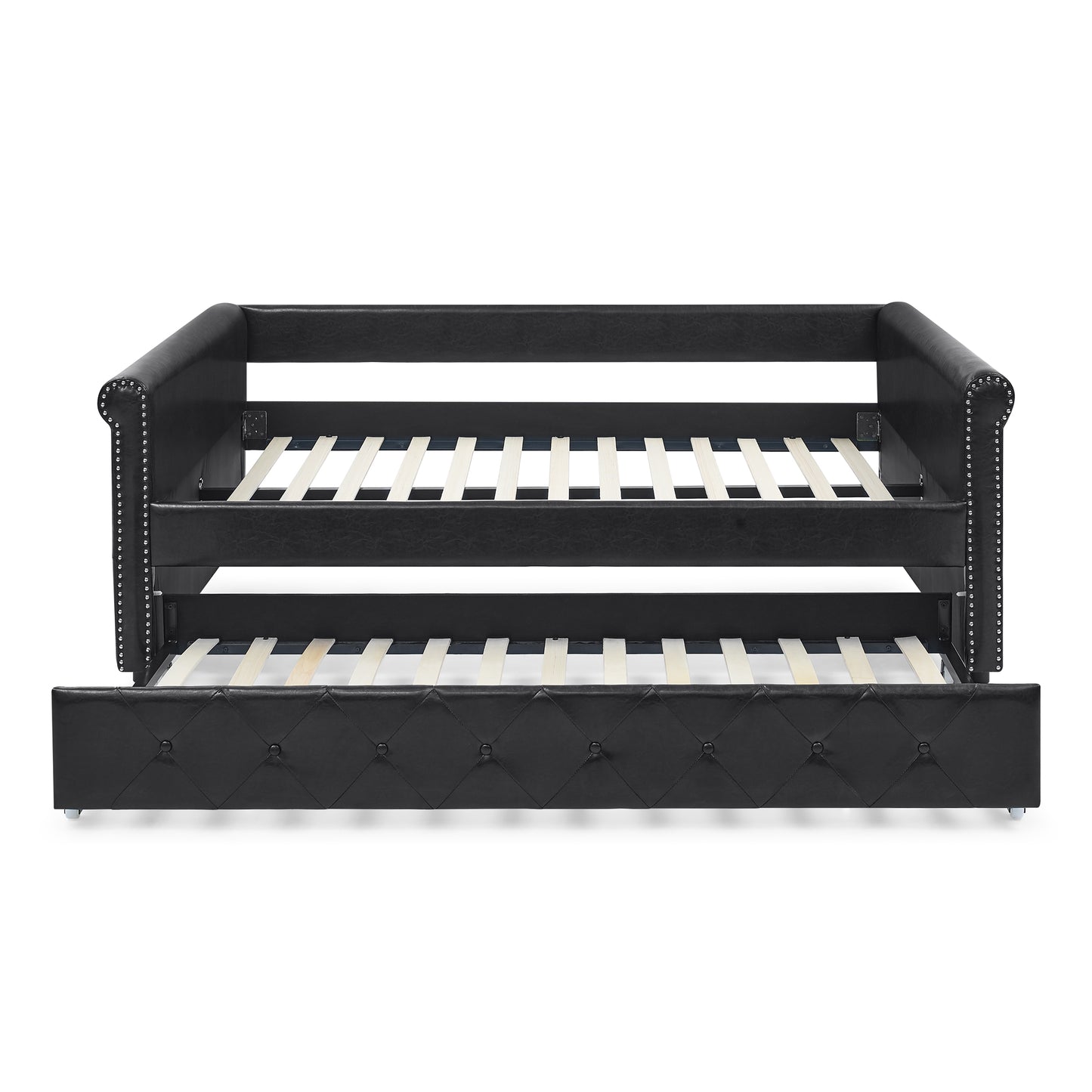 Twin Size Daybed with Trundle Upholstered Tufted Sofa Bed with Button and Copper Nails- Black, PU