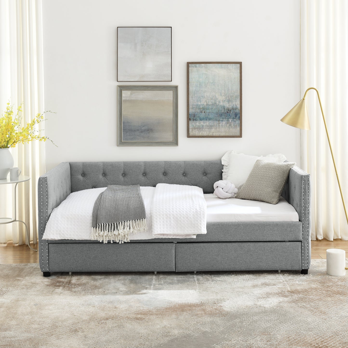 Two Drawers Upholstered Tufted Twin Size Daybed with Nail Heads- Grey