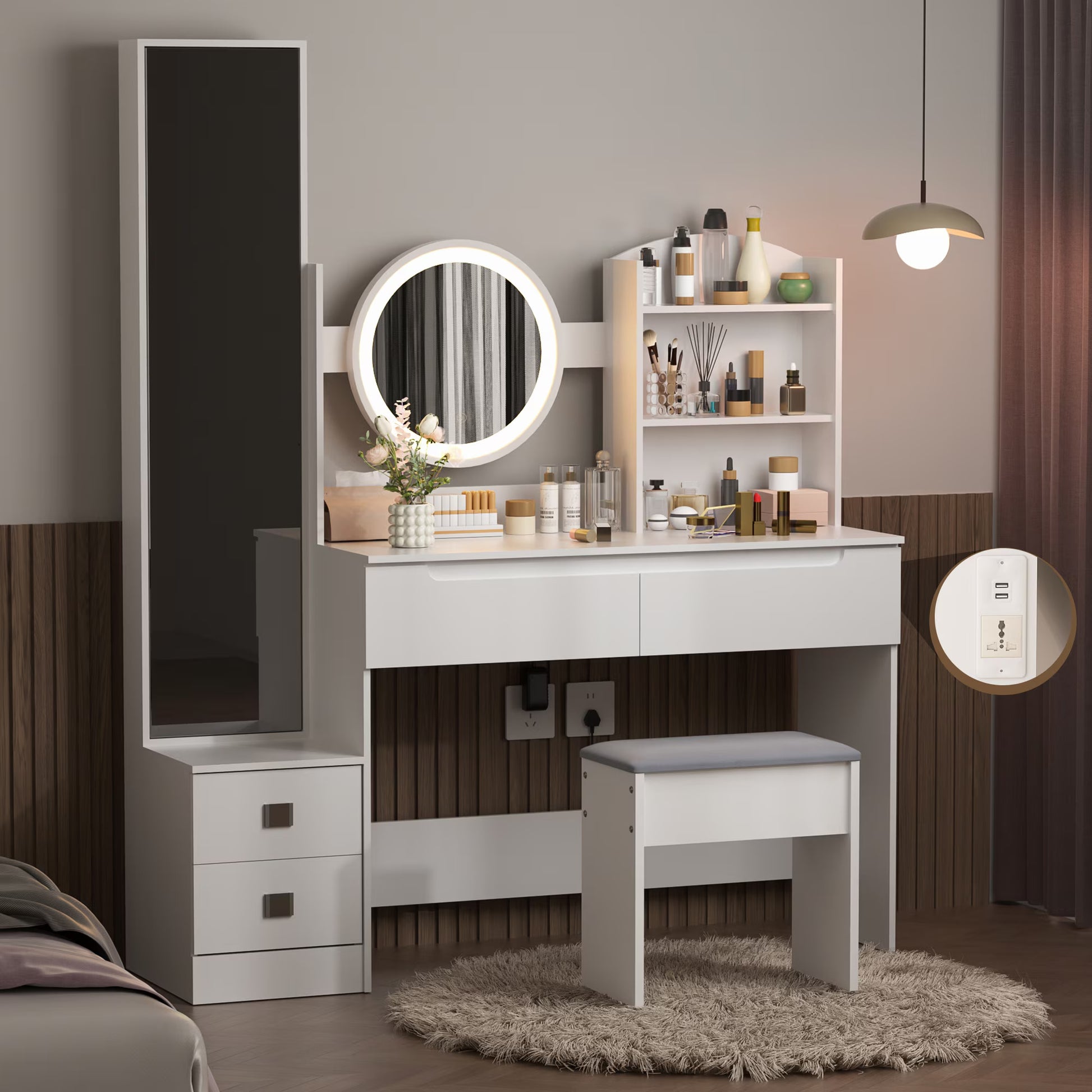 In order to meet the needs of collecting cosmetics, enjoy a comfortable space. Large capacity multi-area storage, open compartment at any time access to cosmetics, intimate partition can prevent the beloved things fall. The desktop is flat and spacious, unlocking more hand space. Intelligent Makeup Mirror, your professional lighting department, adjustable lighting, to help you create a beautiful appearance, create highlight time.