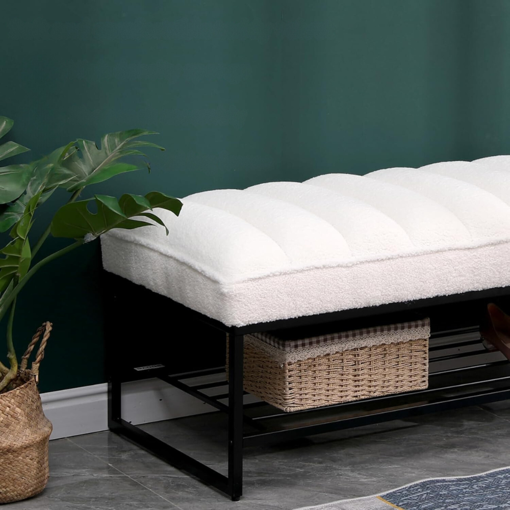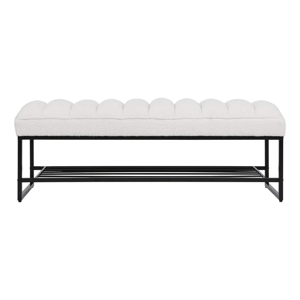 White Sherpa Channel Tufted Bench with Metal Shelf