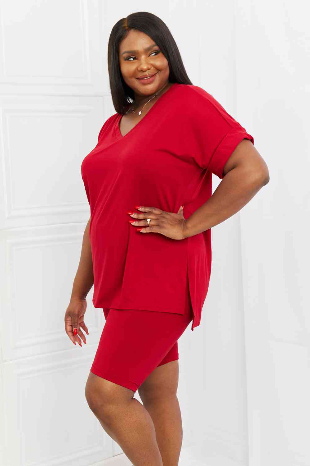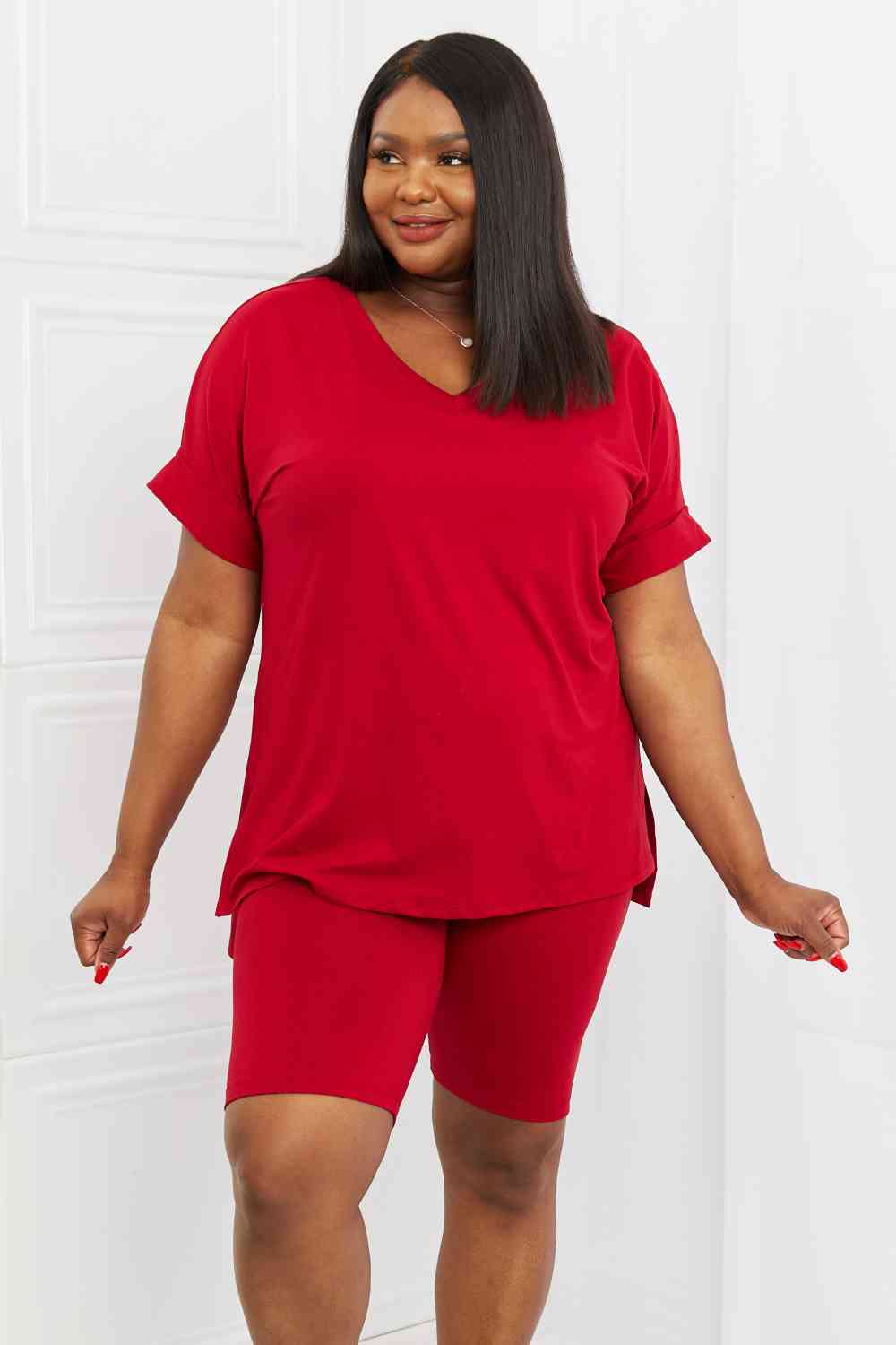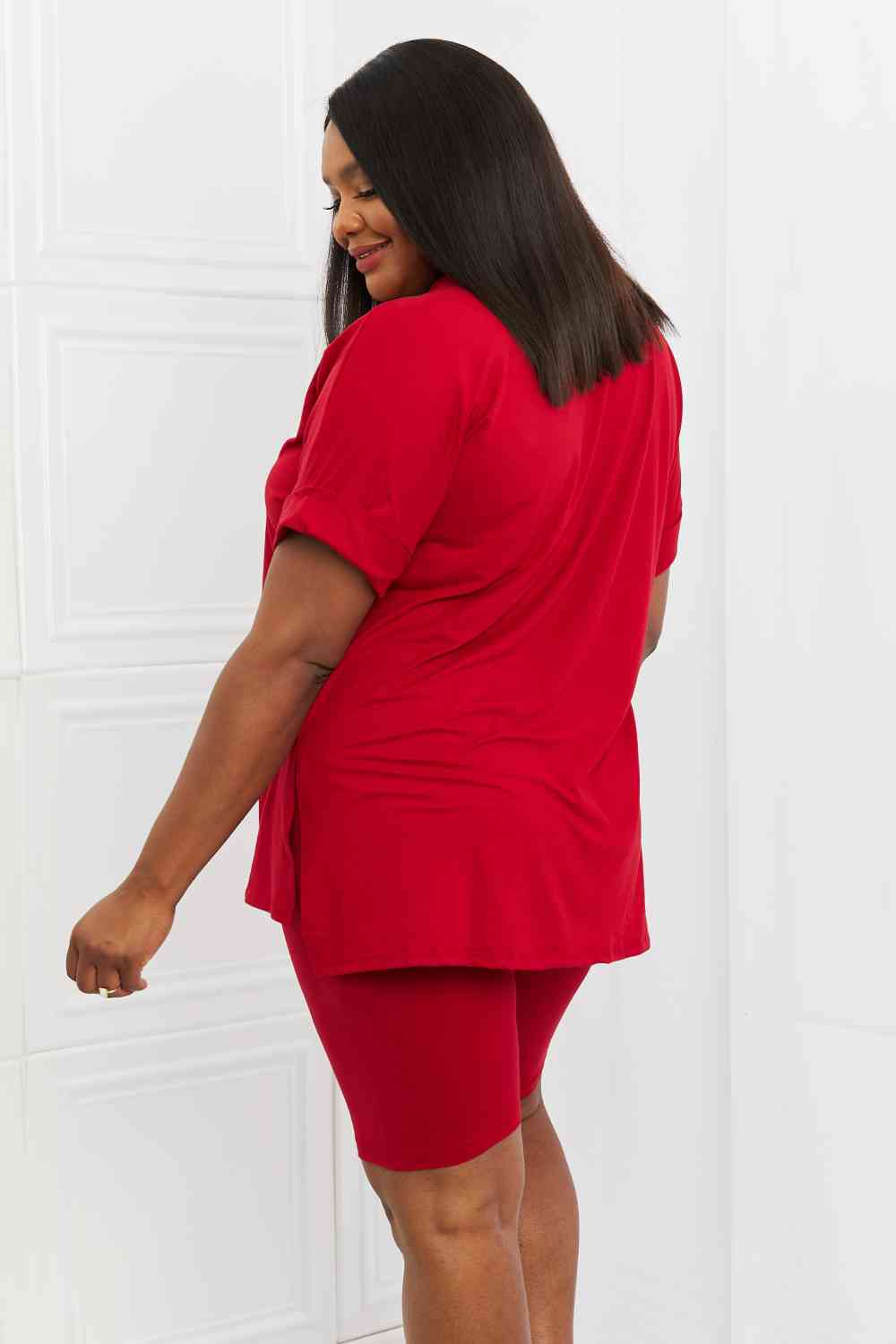 Quiet moments may be few and far between but comfort doesn't have to be! Your skin will love this set, which comes with a brushed DTY microfiber top and biker shorts. The high-low hem top allows for an easy front tuck to emphasize your waist, and the high rise biker shorts were made for comfort. Mix and match or wear together.